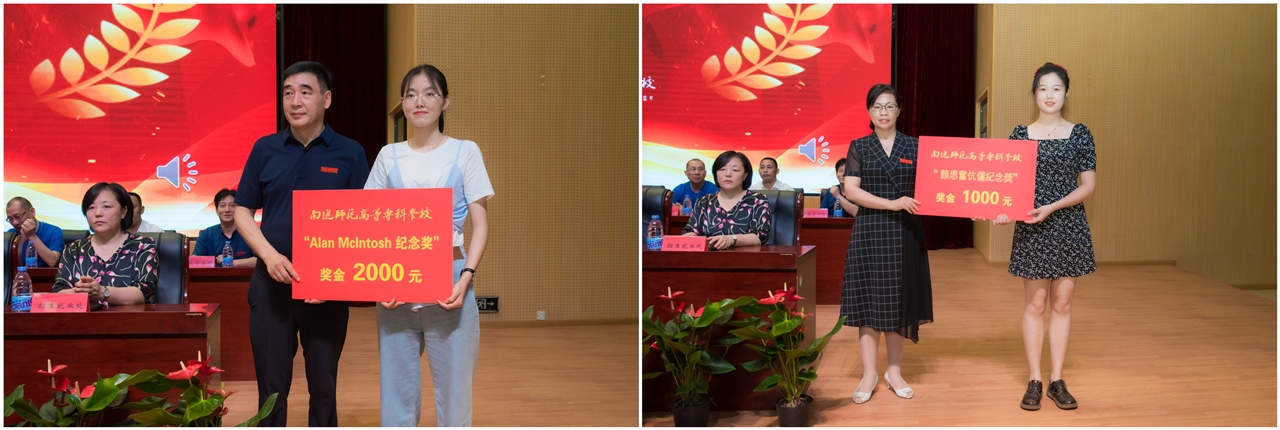 刘锋书记和朱月萍校长分别向优秀毕业生颁发Alan Mclntosh纪念奖和颜思奋伉俪纪念奖。