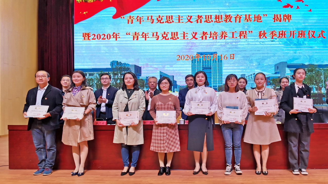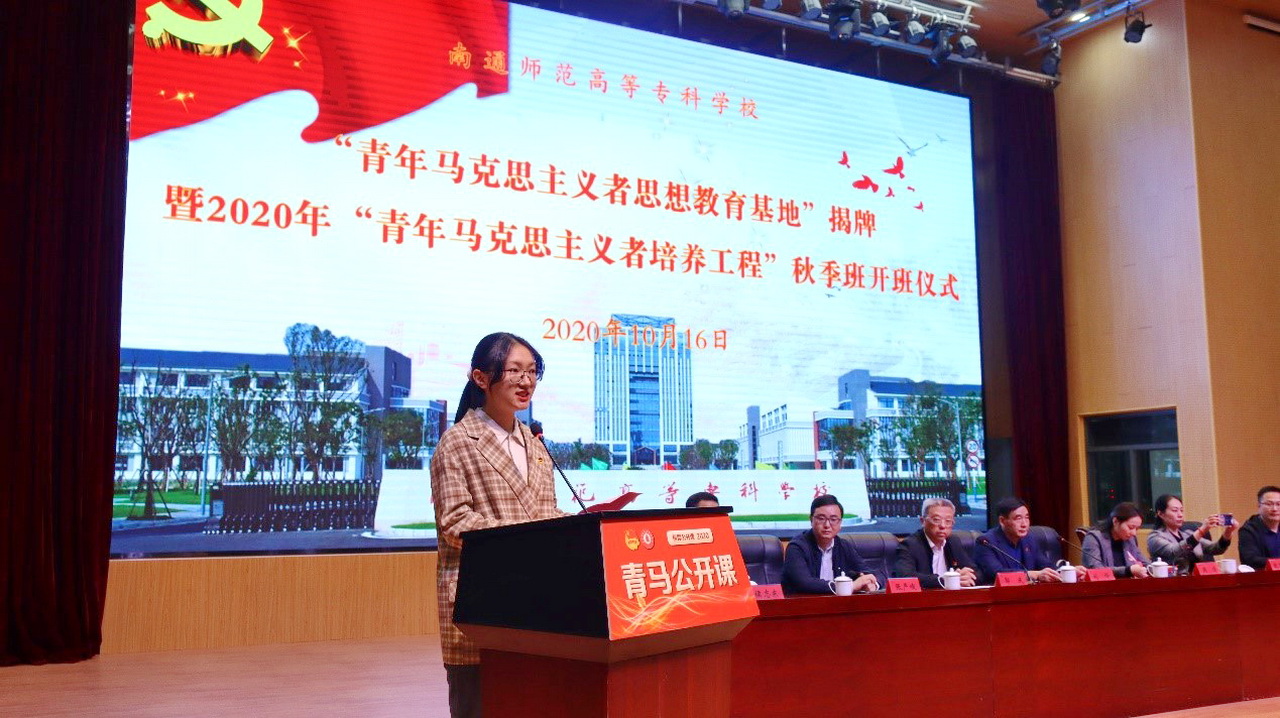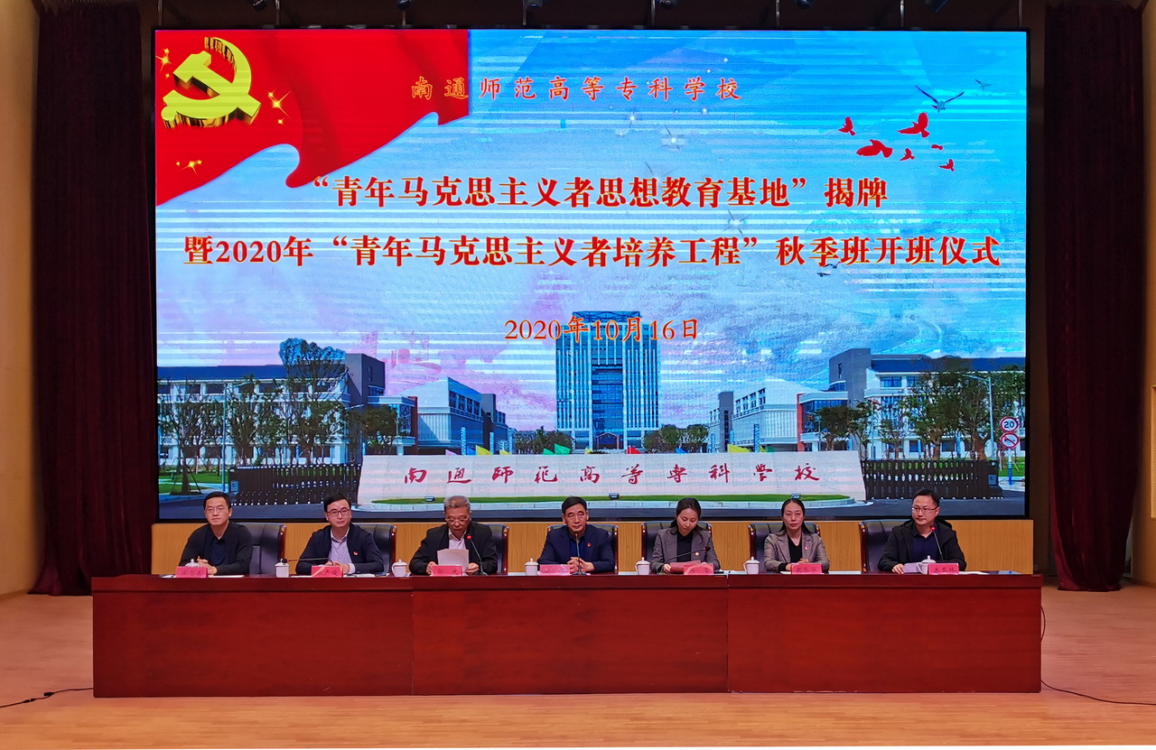 为进一步深入学习贯彻习近平新时代中国特色社会主义思想,在共青团南通市委的大力支持下,在学校党委的正确指导下,10月16日,“青年马克思主义者思想教育基地”揭牌暨2020年“青年马克思主义者培养工程”秋季班开班仪式在南通师范高等专科学校大报告厅举行。