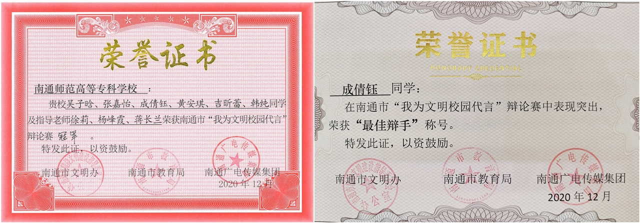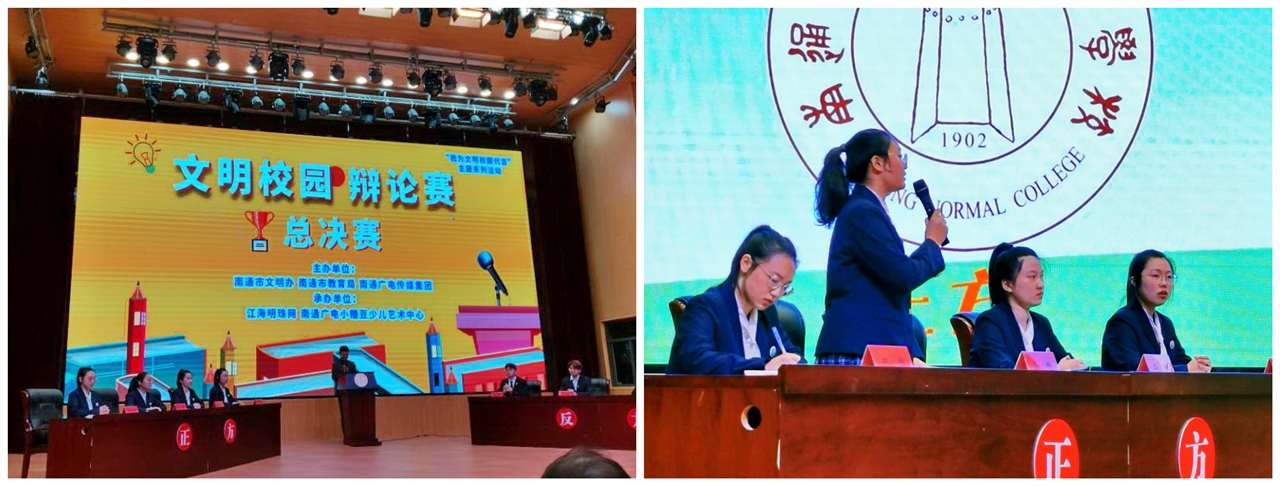 暨2020年11月13日与南通大学的对决中拿下初赛胜利,同月22日在与江苏工程职业技术学院的对决中拿下半决赛胜利,由初等教育学院小教18(1)的六名辩手吴子晗、张嘉怡、成倩钰、黄安琪、吉昕蕾、韩纯组成的我校代表队在导师团队的指导下,从8支大学代表队中脱颖而出,与南通理工学院代表队上演“巅峰对决”。