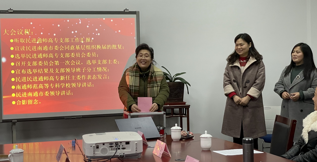 首先,我校民进支部主委陈建同志对本届支部工作进行了总结汇报。民进南通市委驻会秘书长宣读了《关于民进南通市委会同意基层组织换届的批复》。随后,进行了选举及召开支部委员会第一次会议。选举宗序亚等3位同志为民进南通市通师高专支部新一届委员会委员。在新一届委员会第一次全体会议上,选举宗序亚同志为主任委员,秦广华同志为副主任委员兼组织委员,张蓓蕾同志为宣传委员。