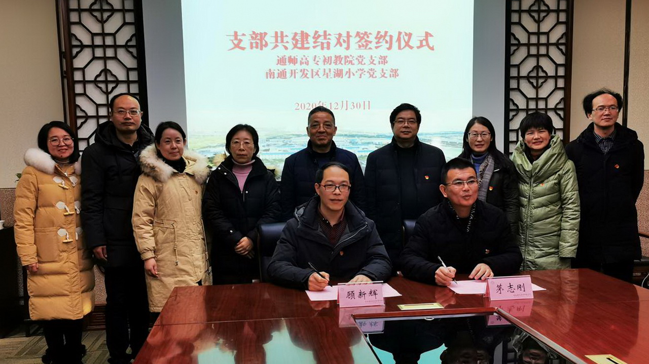 签约一方是南通开发区实验小学教育集团党委书记赵建华带领的星湖小学党支部委员会成员和集团党委办公室负责人,另一方是通师高专初等教育学院党支部书记朱谦祥为首的支委会成员和学院党政办公室负责人。