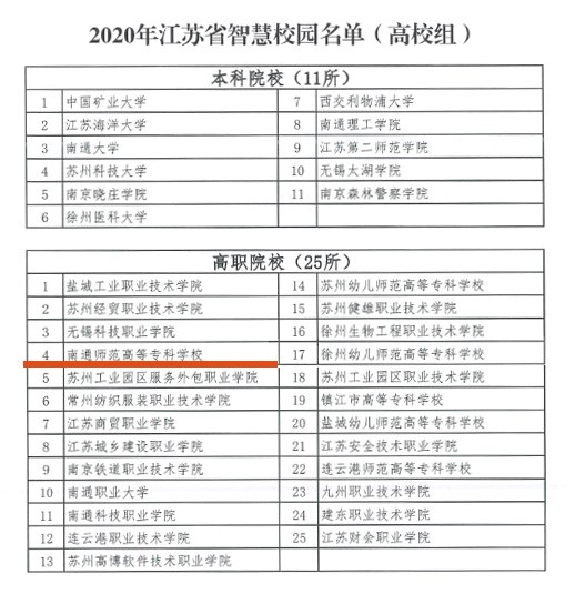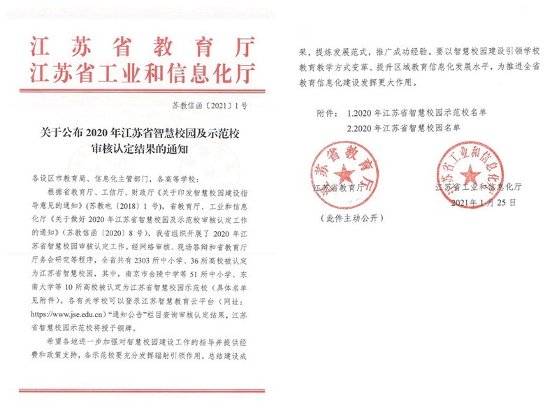 新年伊始,喜讯再传。江苏省教育厅、工业和信息化厅联合发布《关于公布2020年江苏省智慧校园及示范校审核认定结果的通知》(苏教信函【2021】1号),我校被认定为“江苏省智慧校园”。这是我校继获得中国教育和科研计算机网“2020年度优秀会员单位”称号之后,获得的又一殊荣。