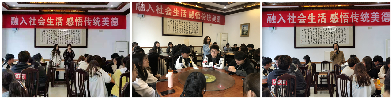 4月11日下午,结合艺术实践课程教学,老师和学生集聚在宏村基地的大厅,举行“融入社会生活,感悟传统美德”主题活动。活动由美术学院书记陈竹林主持。