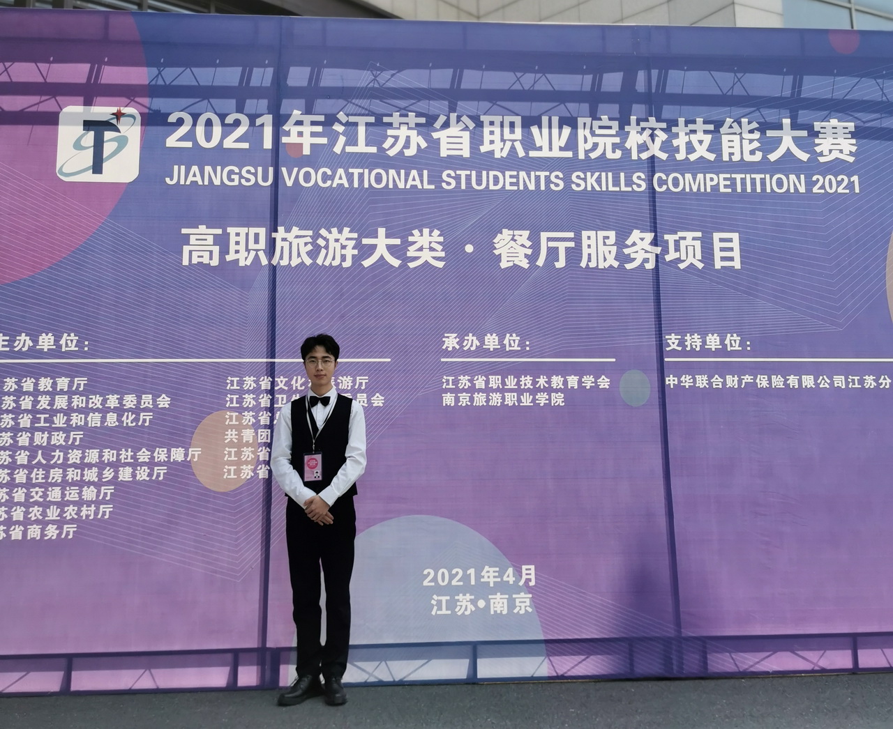 4月11日, 2021年江苏省职业院校技能大赛高职旅游大类餐厅服务项目完成各项赛程,顺利落下帷幕。来自全省32所高职院校代表队62名选手围绕中餐服务、口布折花、西餐服务、饮品制作四大项目各显身手,一决高低。经过两天激烈的角逐,管理学院邮轮英语(专)20级郭浪同学夺得一等奖的好成绩,季佳平老师获优秀指导老师奖。