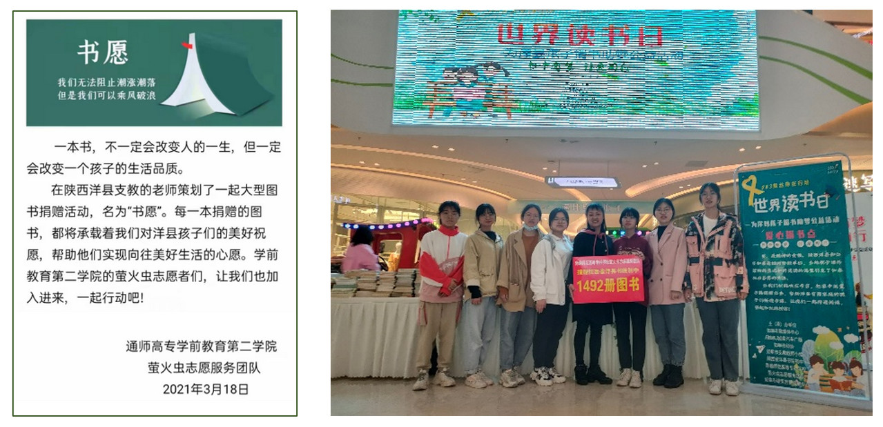 2021年3月,在陕西洋县支教的老师策划了一起大型图书捐赠活动,来帮助洋县地区有需要的孩子完成读书心愿。听闻这一消息,通师高专学前教育第二学院萤火虫志愿服务团队第一时间利用官Q和公众号平台,向全院的学生发起倡议,号召大家一起行动,尽己所能来助力孩子们圆梦“书愿”。萤火虫志愿者们积极响应,在不到一个月的时间就募捐到了2000多本图书。经过两轮筛选,最终精选出符合捐赠要求的图书1492本。