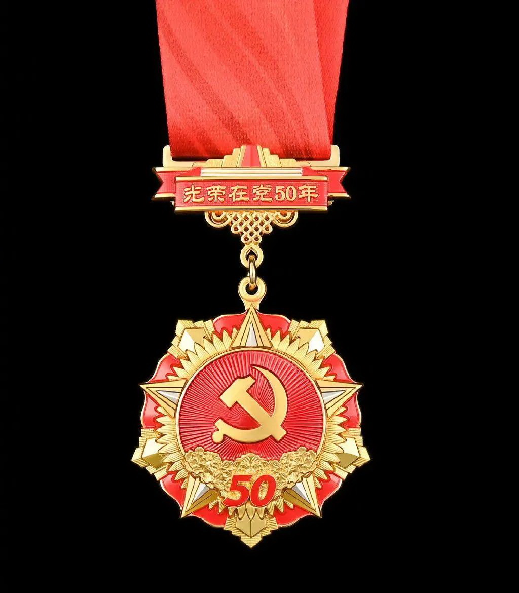 “光荣在党50年”纪念章通径为50毫米,材质为铜和锌合金,主色调为红色和金色。主章由党徽、五角星、旗帜、丰碑、向日葵、光荣花、光芒等元素构成,其中党徽象征党的领导核心地位和党员信念坚定、对党忠诚;丰碑寓意党的光辉历程和丰功伟绩;向日葵寓意全党全国各族人民紧密团结在党中央周围;光芒象征党的光辉照耀;五角星代表薪火相传;光荣花寓意繁荣盛世、国泰民安和褒奖荣耀;旗帜象征共产主义崇高理想与事业永续。副章由山河、中国结和红飘带等元素组成,飘带上雕有“光荣在党50年”字样,寓意党员不忘初心、牢记使命,勇攀高峰、永葆青春。