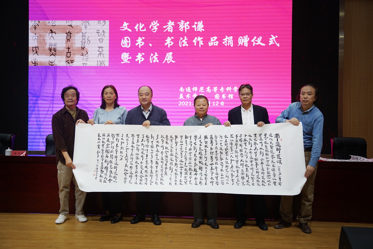 郭谦是通师高专79届学员(原海门师范中文班),其父亲郭可慈先生是南通师范49届简师班学员,他情系母校,把两代人的文化作品送到母校,是最好的归宿,将会得到更好的收藏和传播。学校纪委书记潘健宣布文化学者郭谦先生图书、书法作品捐赠仪式暨书法作品展开始。接着,郭谦先生向图书馆馆长陈洪美捐赠《现代作家亲缘录》等26本,书法作品《南通师范颂》等3副,陈洪美为郭谦先生颁发了捐赠证书,张云霄同学朗读了郭谦的文学作品——南通师范颂。
