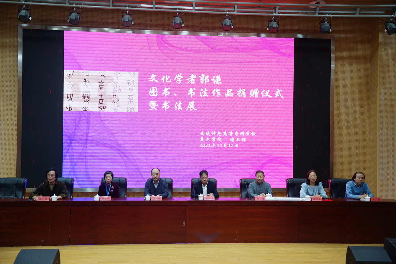 10月12日上午,杰出校友文化学者郭谦先生图书、书法作品捐赠暨书法作品展在学校图文信息中心小报告厅举行。活动由美术学院党支部陈竹林书记主持。南通考试院副院长李志丹,文化学者郭谦及其夫人邢志玖,学校党委副书记、纪委书记潘健,图书馆馆长陈洪美,美术学院院长朱敏以及部分师生参加了本次活动。