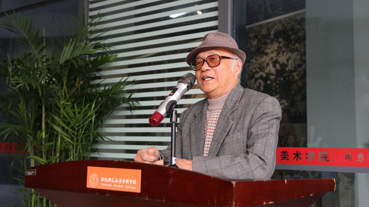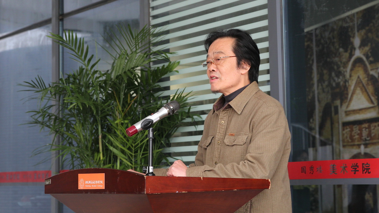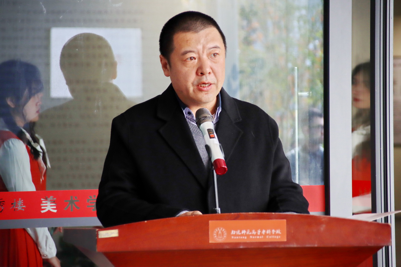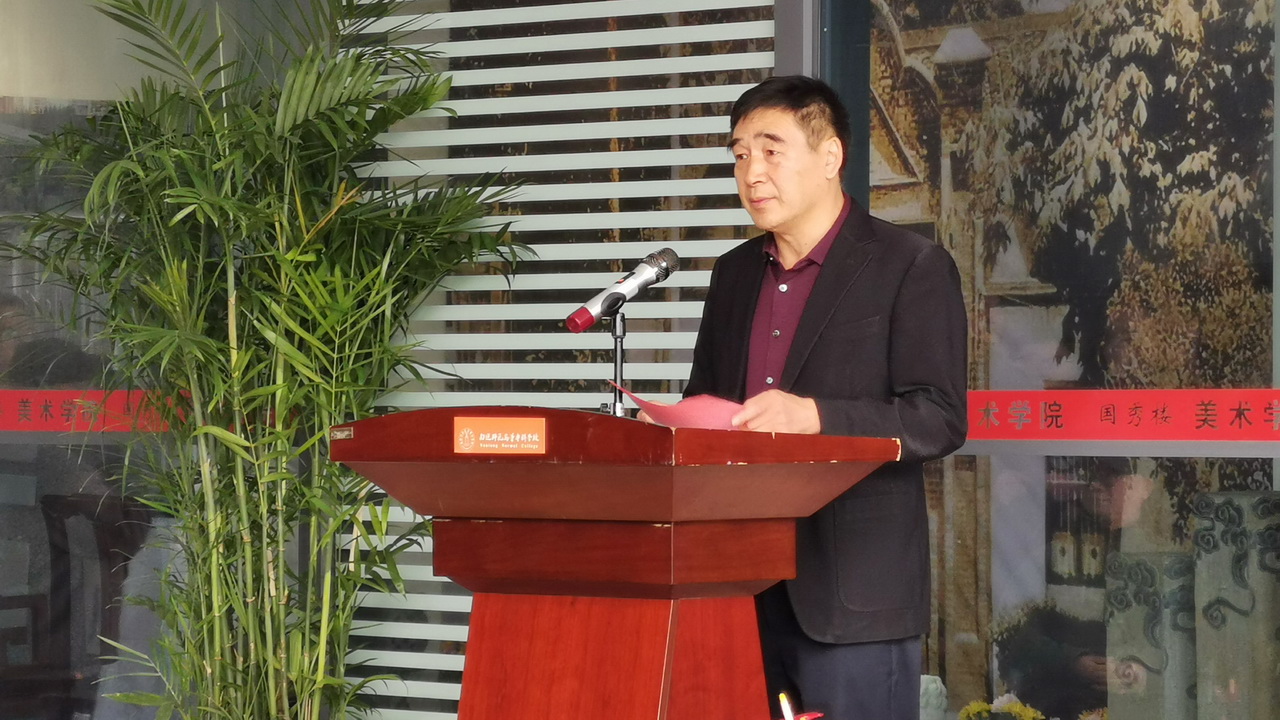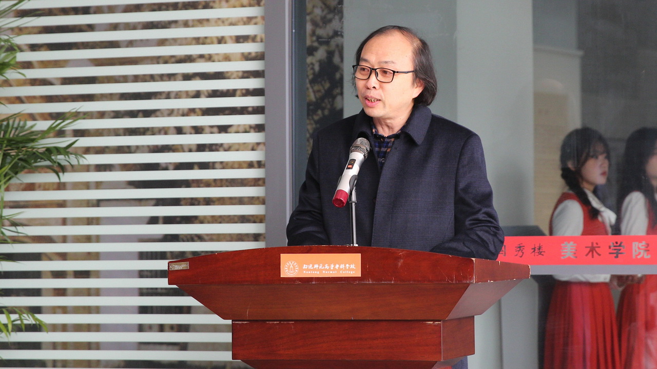 刘锋代表通师高专党委、校长室致辞,他指出,尤无曲先生几代人均和师范有缘,先生与师范百年相关相融的家世、师友经历,不仅是我校百年师范发展的缩影,也是一笔弥足珍贵的财富。先生长孙尤灿先生,致力于整理、研究、宣传其祖父非凡的艺术成就和传奇人生已有二十余载,让我们看到了尤氏家族文化有承有绪,更可传可新。今天,美术学院举行先生归来之展览,能让我们更好地领略先生开拓胸襟、立定志愿、不厌不倦的艺术人生。希望大家能用心观摩,细心体会,在赏悦中学习先生为学、治事、做人之道,真正做到有所悟,有所得,有所行,为新时代师范教育发展,为学校升格发展积蓄更多更强的力量。