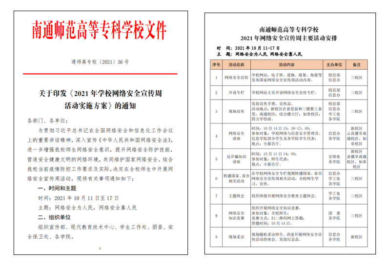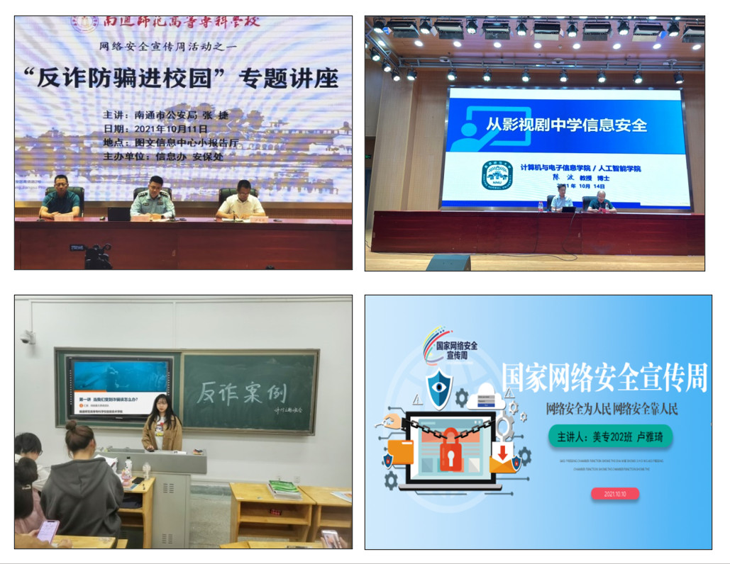 2021年10月11-17日,市委网信办集中开展了网络安全宣传周活动。按照要求,我校成立了专门领导小组,由现教中心牵头,组织宣传部、学生工作处、团委、安全保卫处、各学院等多部门参与,制定了《2021年南通师范高等专科学校网络安全宣传周活动方案》,并结合我校实际,明确了活动内容、形式和各部门工作分工。现教中心还制定了详细的活动安排表,进行工作细分,任务落实到人。
