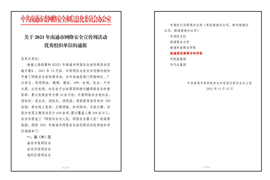 近日,中共南通市委网络安全和信息化委员会办公室表彰了2021年南通市网络安全宣传周活动优秀组织单位,我校网络安全宣传周工作扎实有效,活动丰富多彩,参与师生众多,宣传成效显著,受到了市网信办的表彰。