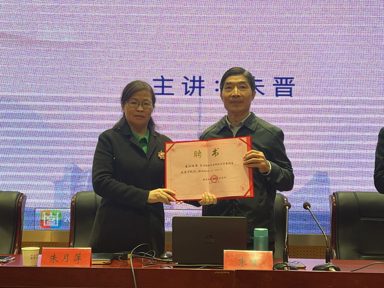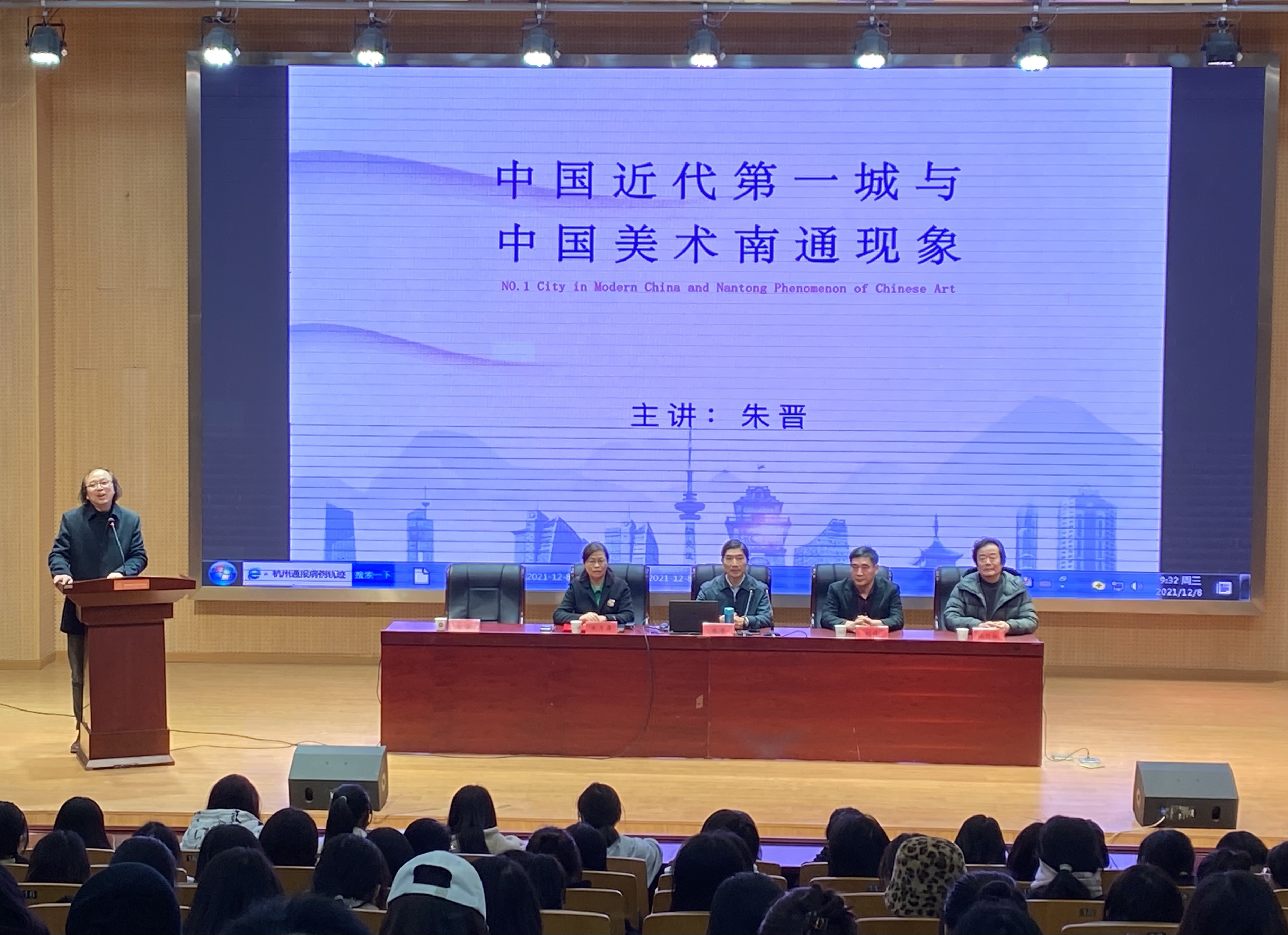 12月8日,原南通市副市长,现南通市红十字会会长朱晋应邀来到我校,在图文信息中心报告厅为美术学院师生作“中国近代第一城、中国美术南通现象”讲座,同时,学校举行客座教授聘任仪式。学校党委书记刘锋,副书记、校长朱月萍,美术学院书记陈竹林,院长朱敏,美术学院的150多名学生参加了活动。朱月萍为朱晋颁发了南通师范高等专科学校客座教授聘书。