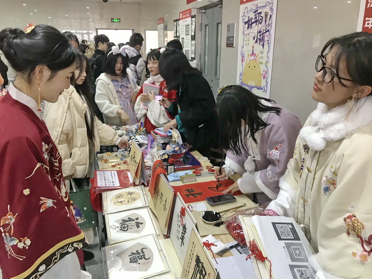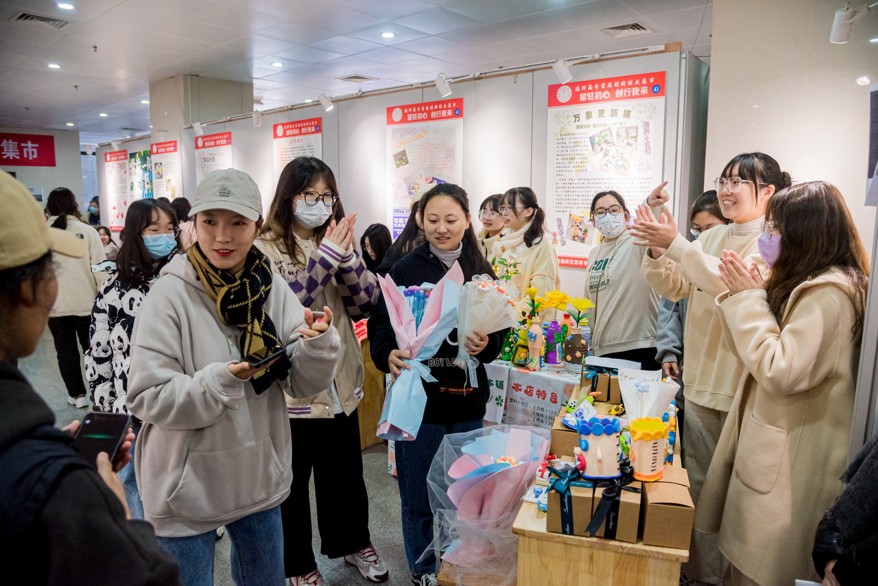 美术学院的李乐君团队,将师范文化元素和明信片、印章等结合起来,成为本届创新创业集市的销冠王。由于成品售罄,他们转换了销售思路,承接了近两千元的期单;获得销售榜眼的是美术学院唐子珈团队,他们身穿美丽的汉服,用自己的巧手制成的女红作品,吸引了大批爱美的师生。在这里,你能欣赏到学前教育学院的剪纸和泥塑的精巧,能感慨到初等教育学院的创意小屋的魅力,能赞叹到信息技术学院乐高编程作品的精妙,能感怀到管理学院的关注双碳的情怀,能领略到音乐舞蹈学院的动态展示的精业,能叹服于美术学院书画和手工的精美,能体会到体育学院学生志愿服务的热忱。