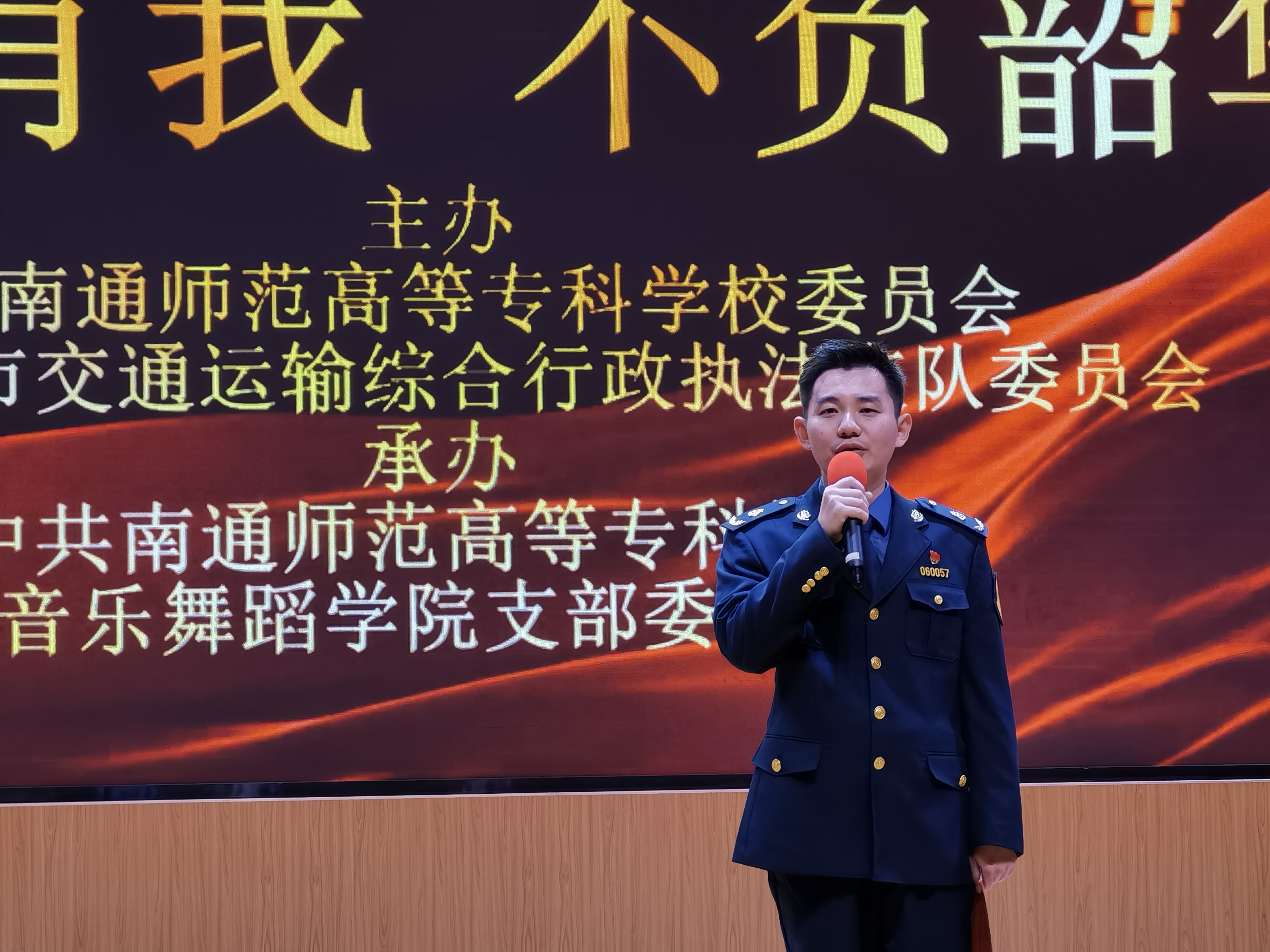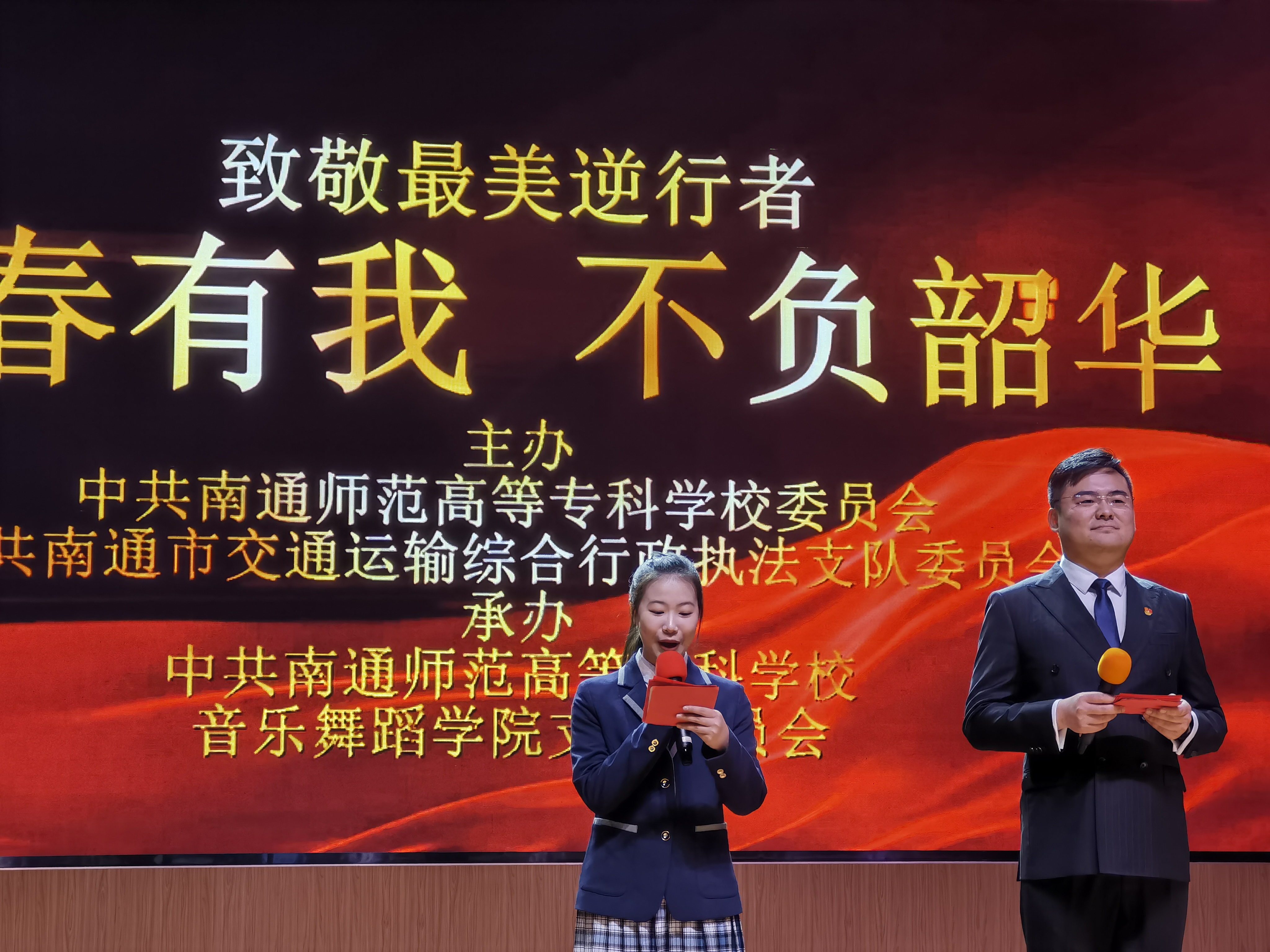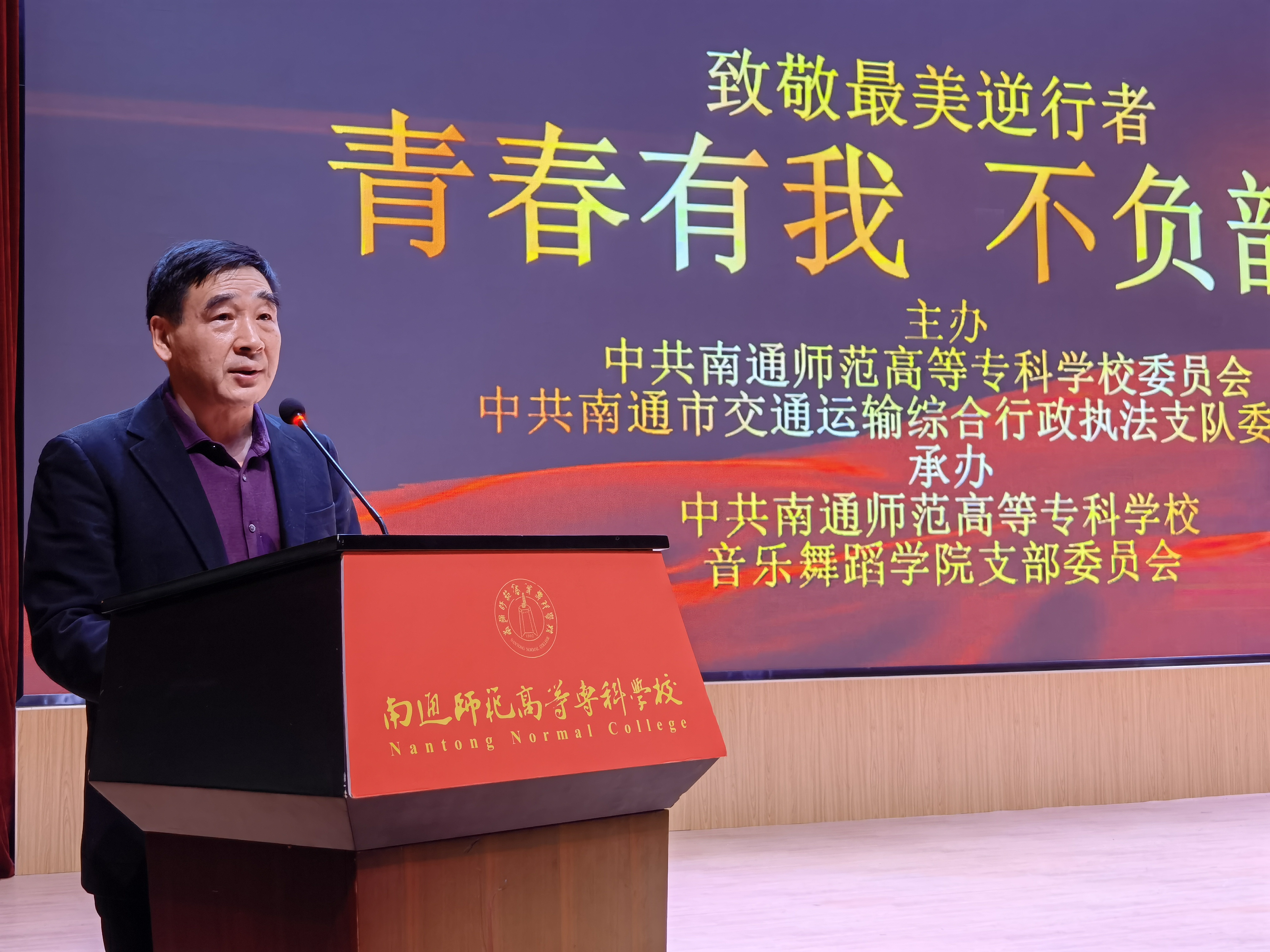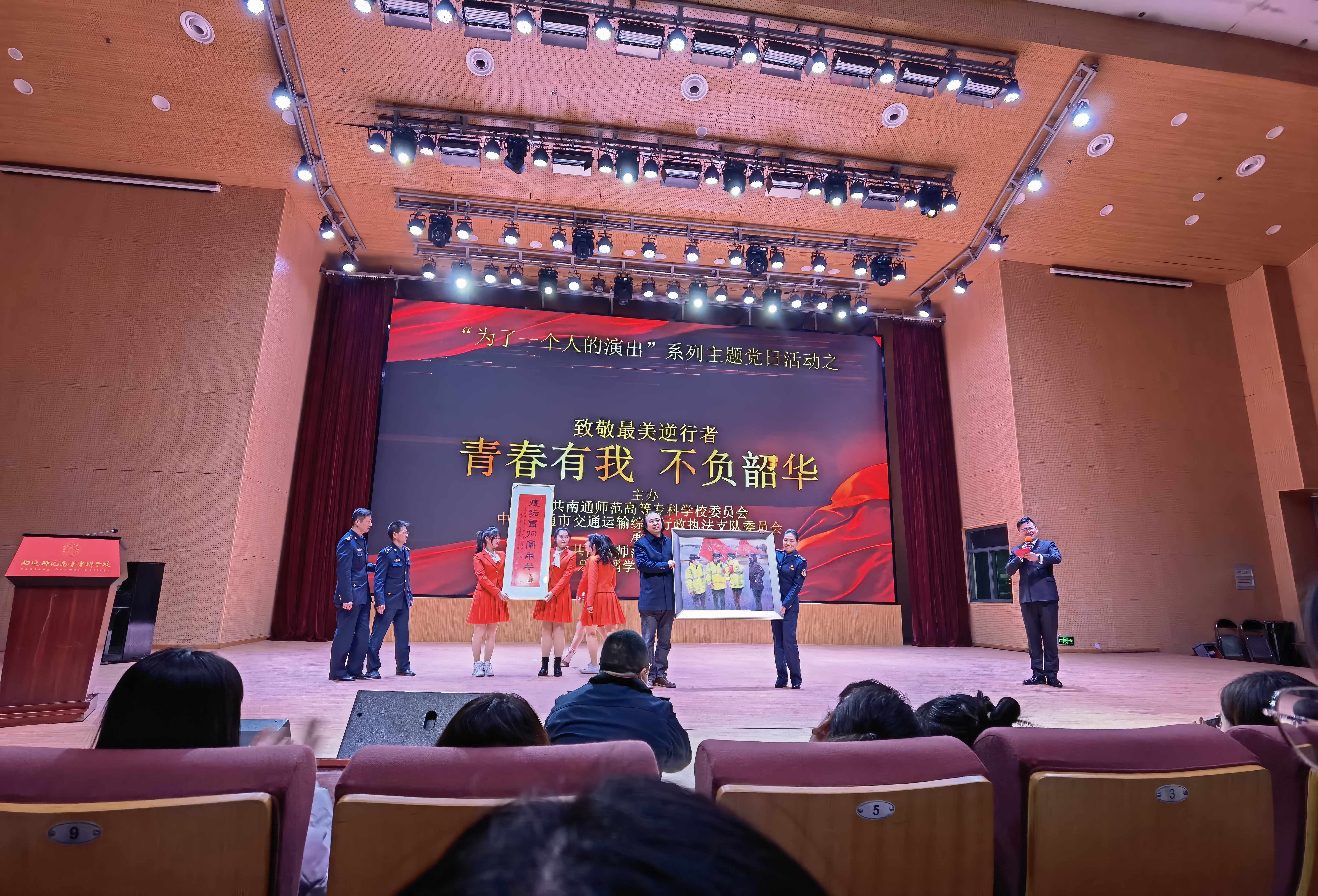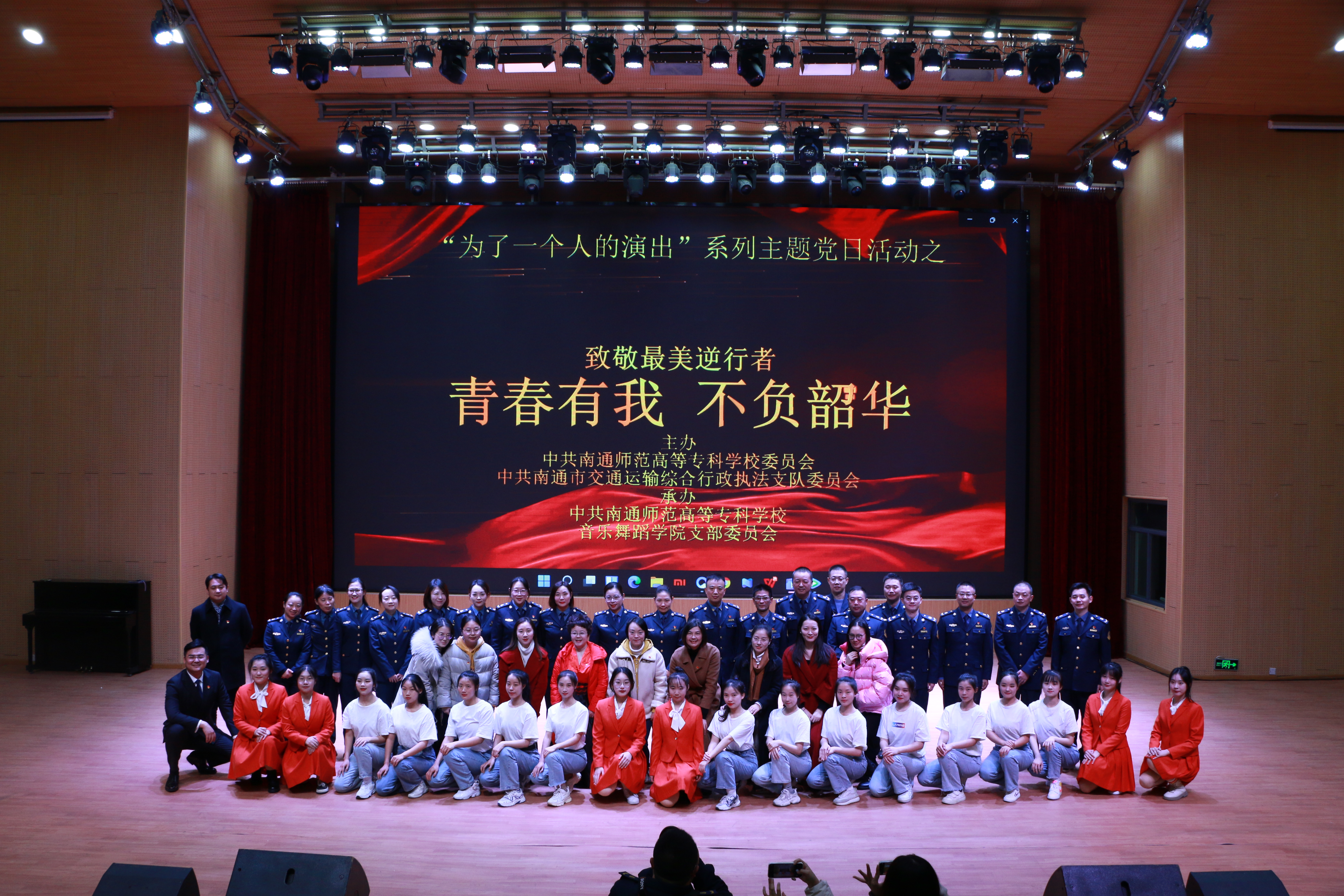 为了进一步学习贯彻习近平新时代中国特色社会主义思想,落实高校党的基层组织建设新要求,提升支部组织生活质量与品质,扎实做好党员先进性教育,发挥“党建带团建”的指导引领作用,12月13日下午3:30,音乐舞蹈学院党支部于学校图文信息楼大报告厅举办了“为了一个人的演出”系列主题党日活动之“致敬最美逆行者——‘青春有我,不负韶华’”主题党团日活动暨思政大班会课。本次活动受到南通师范高等专科学校党委和南通市交通运输综合行政执法支队党委的高度重视,校党委书记刘锋同志亲临现场指导,支队党委指派多名党员同志出席活动。音乐舞蹈学院党支部全体党员、入党积极分子、辅导员(班主任)、教职工代表、学院全体学生参加本次活动。