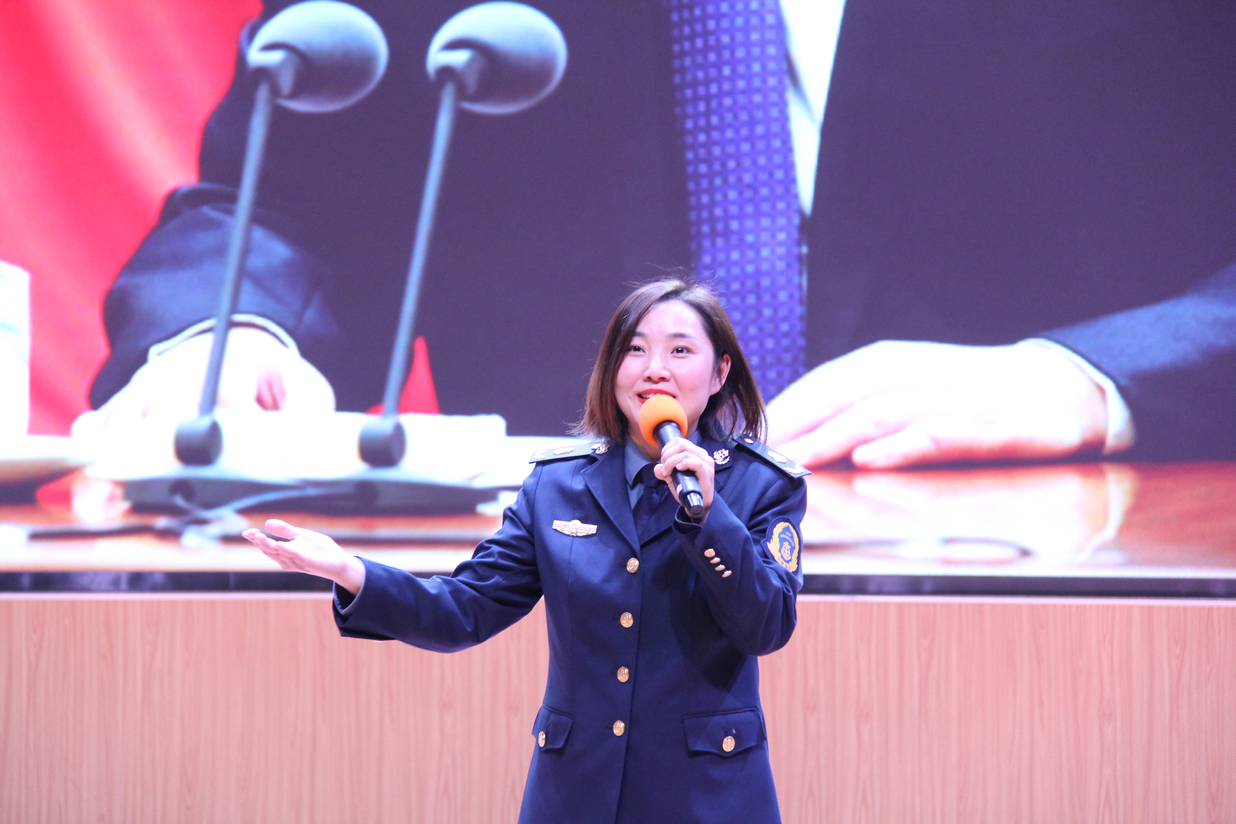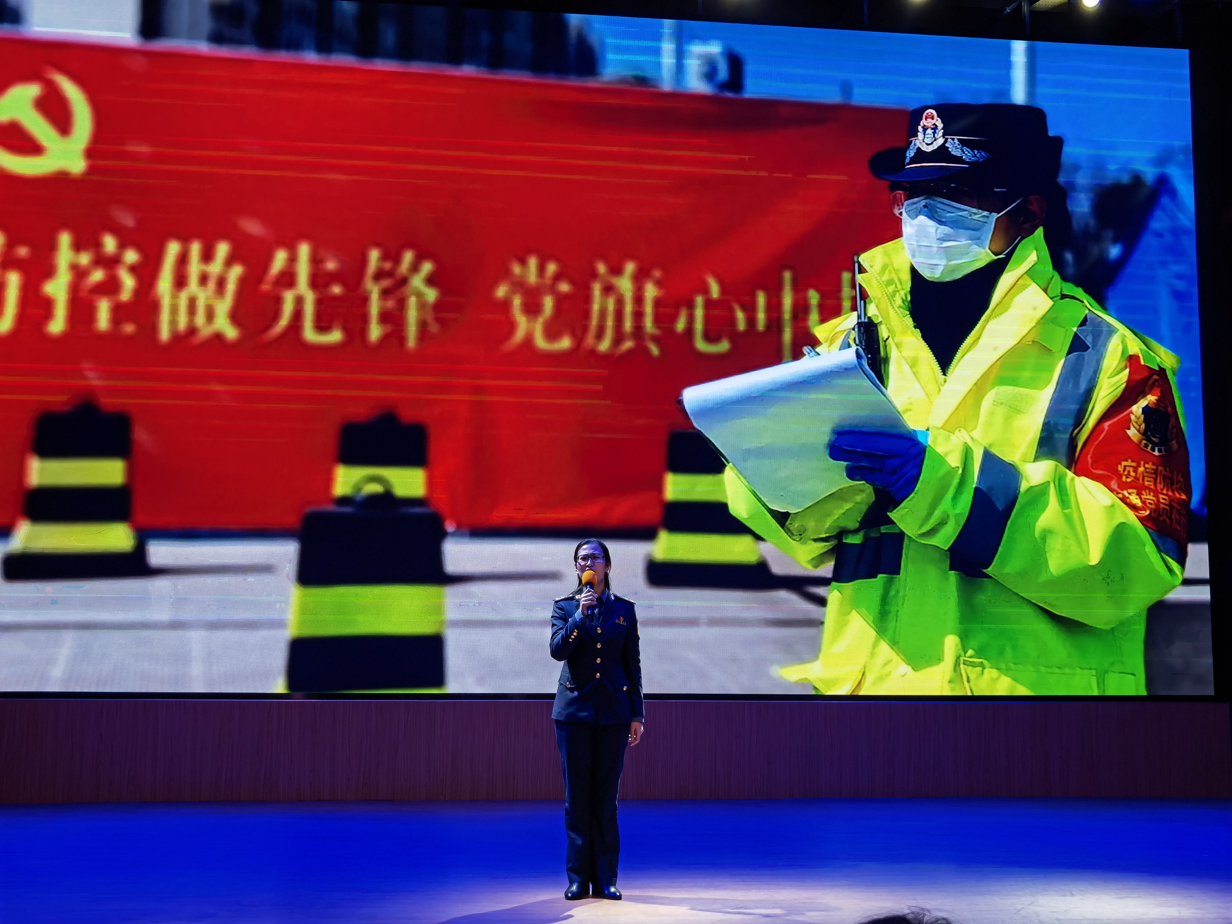 在事迹分享篇章,全国抗击新冠肺炎疫情先进个人朱林志分享了其参加全国表彰大会的体会和感悟。支队青年突击队成员刘忆言根据抗疫防疫的亲身经历发表了《“疫”路高歌写忠诚》演讲,感人至深;青年党员杨姣根据自己和丈夫春节期间“舍小家为大家”、奋战在抗疫一线的真实体验,深情朗诵了自己的原创诗歌《他们的星空》。随后,全场观众观看了支队党委代表演绎的《交通战“疫”歌》原创歌曲视频。