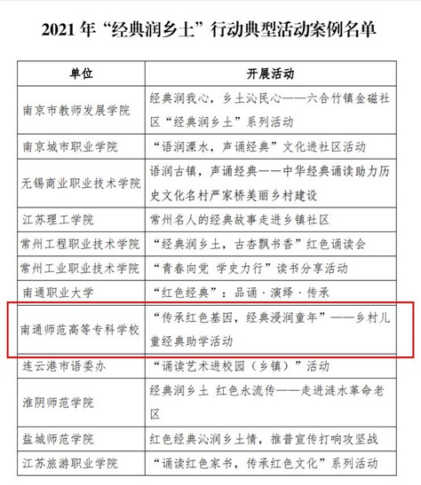 近日,省语委办公室、省教育厅办公室联合发文,公布了江苏省2021年“经典润乡土”行动典型活动案例。全省共评选出典型活动案例12个,我校“传承红色基因,经典浸润童年”—— 乡村儿童经典助学活动成功入选其中。