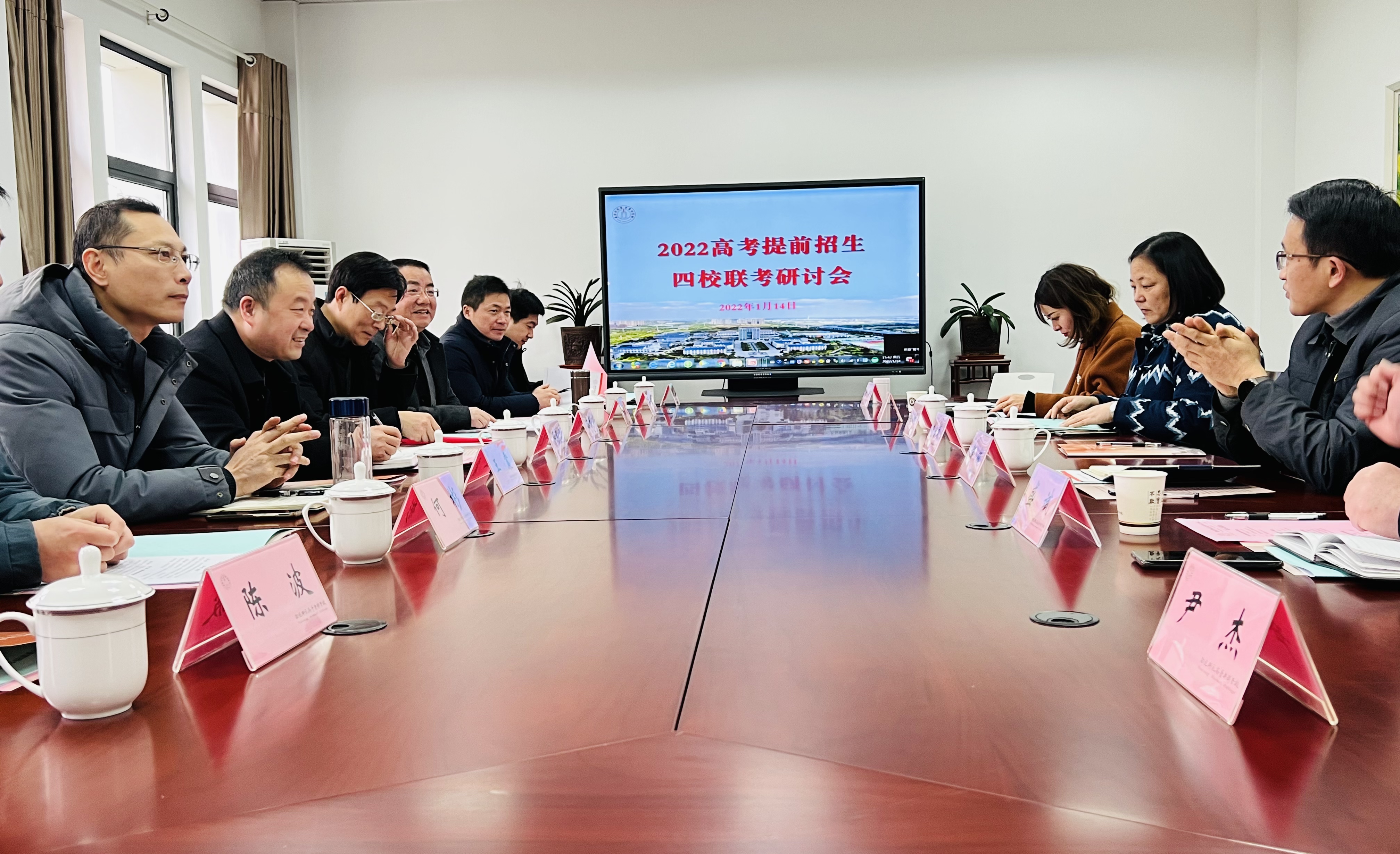 1月14日下午,2022年高考提前招生四校联考研讨会在时孙楼105会议室召开,连云港师范高等专科学校、徐州幼儿师范高等专科学校、盐城幼儿师范高等专科学校与我校主要领导出席了会议,会议审定了2022年高考提前招生四校联考章程,研讨了联考工作方案。会议由招就处副处长盛斌主持。