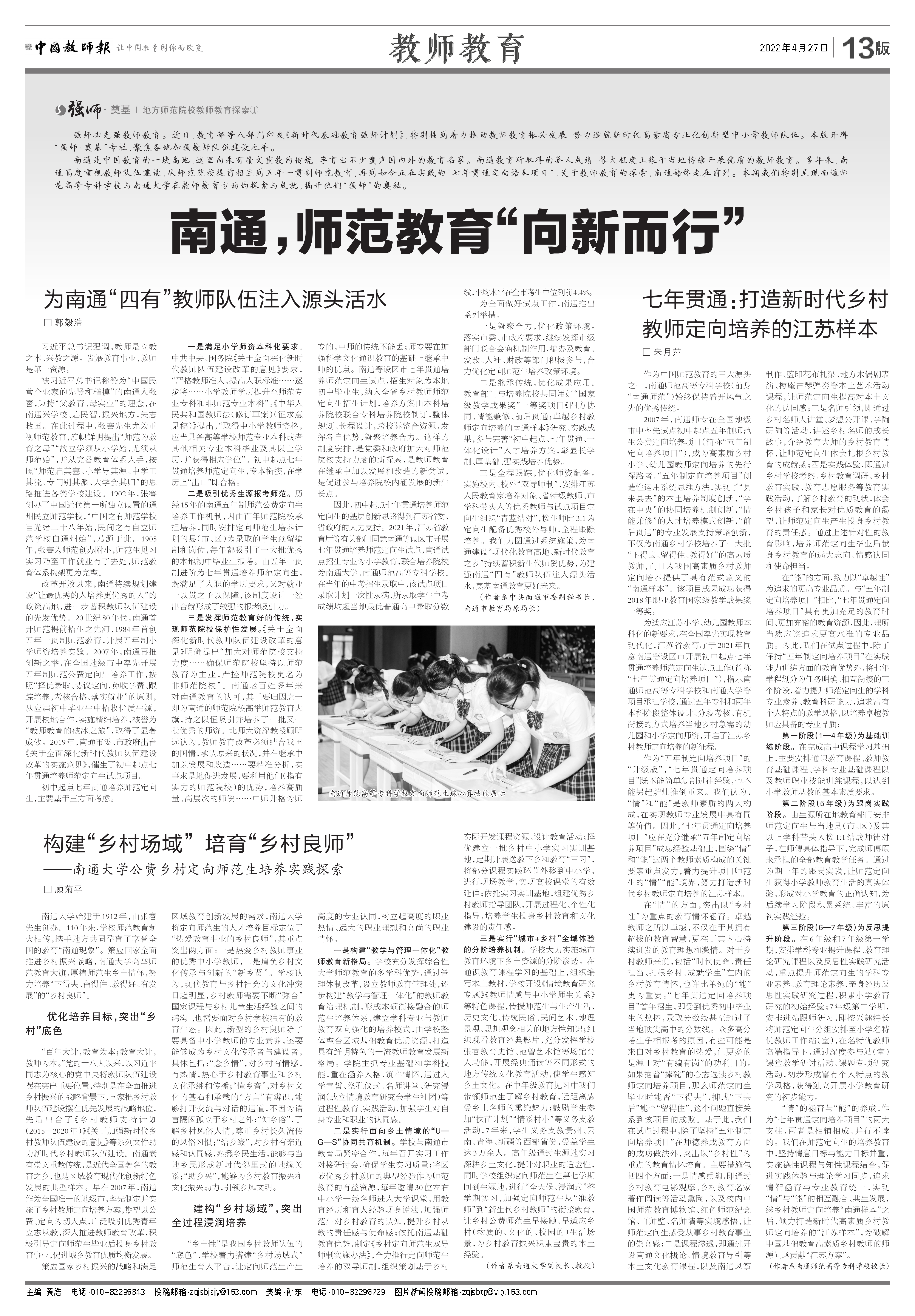 《中国教师报》2022年4月27日以《南通,师范教育“向新而行”》为通栏标题,聚焦南通“初中起点七年贯通培养师范定向生”试点项目,呈现南通“校地协同,强师固本”的教师教育创新实践。这是该报在教育部等八部门印发《新时代基础教育强师计划》后,特别开辟“强师·奠基”专栏推出的首期报道。