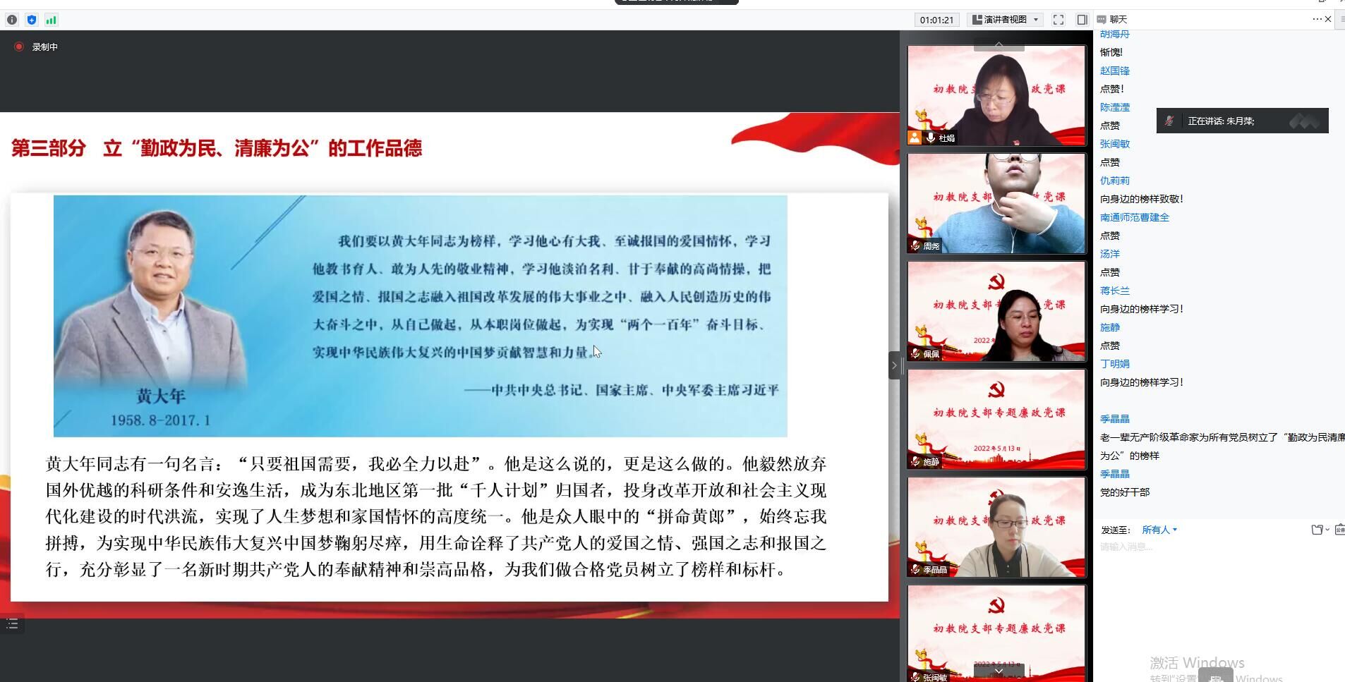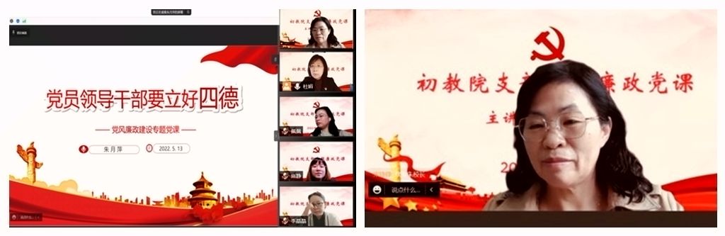 5月13日下午,校长朱月萍同志以腾讯会议的方式给初教院领导班子成员、支部全体党员上了一堂题为《党员领导干部要立好四德》的党风廉政建设专题党课。朱月萍同志从立“坚定紧跟、绝对忠诚”的政治品德、立“积极向上、崇真向善”的思想品德、立“勤政为民、清廉为公”的工作品德、立“戒奢尚俭、不为物诱”的生活品德等四个方面对党员干部提出了要求,勉励大家要牢记初心使命,继承红色精神,以夏明翰、焦裕䘵、孔繁森、黄大年、张桂梅等优秀共产党员为榜样,紧紧围绕“为党育人、为国育才”的工作目标,切实落实立德树人的根本任务,始终践行政治要强、情怀要深、思维要新、视野要广、自律要严、人格要正的要求,以德立身、以德立学、以德施教。