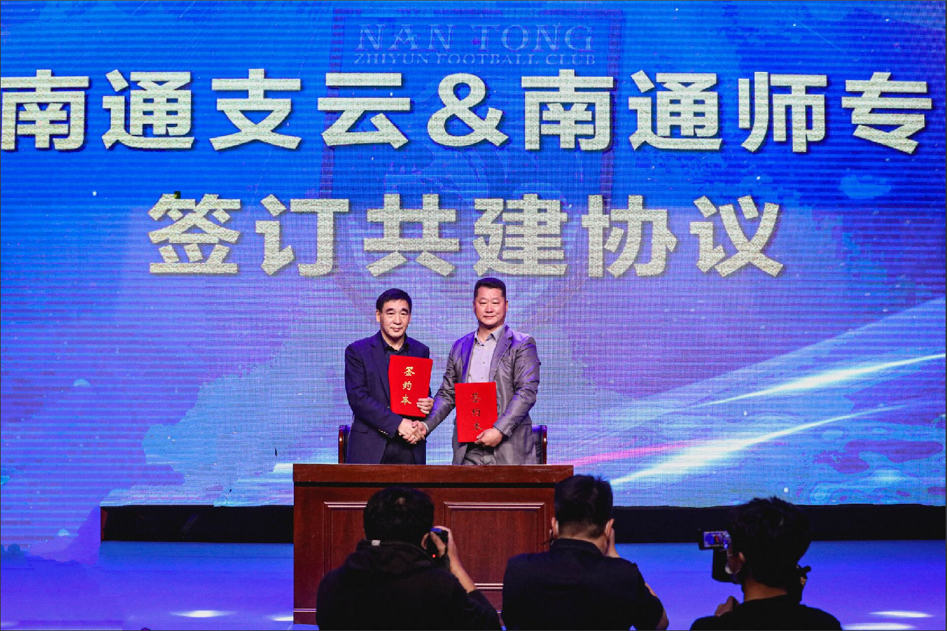 誓师大会现场举行南通支云足球俱乐部与南通高等师范专科学校共建协议签约仪式,支云足球俱乐部主席范兵与通师高专党委书记刘锋共同签署全面合作。今后双方将共同开办足球学院,在学校教育、人才培养、就业扶持等方面开展深入研究与合作,健全足球培训、赛事运营、周边产品开发、场馆服务等专业模块,为南通城市足球产业发展培育优秀的行业人才,加速完成南通市委市政府领导下的足球发展战略。在新时代下,南通支云与通师高专都面临着大好的发展机遇,此次校企合作,恰逢学校120周年校庆,意义重大。