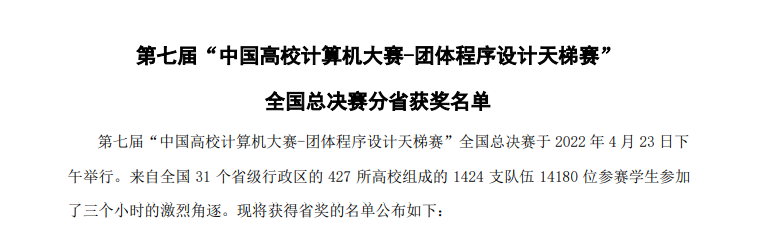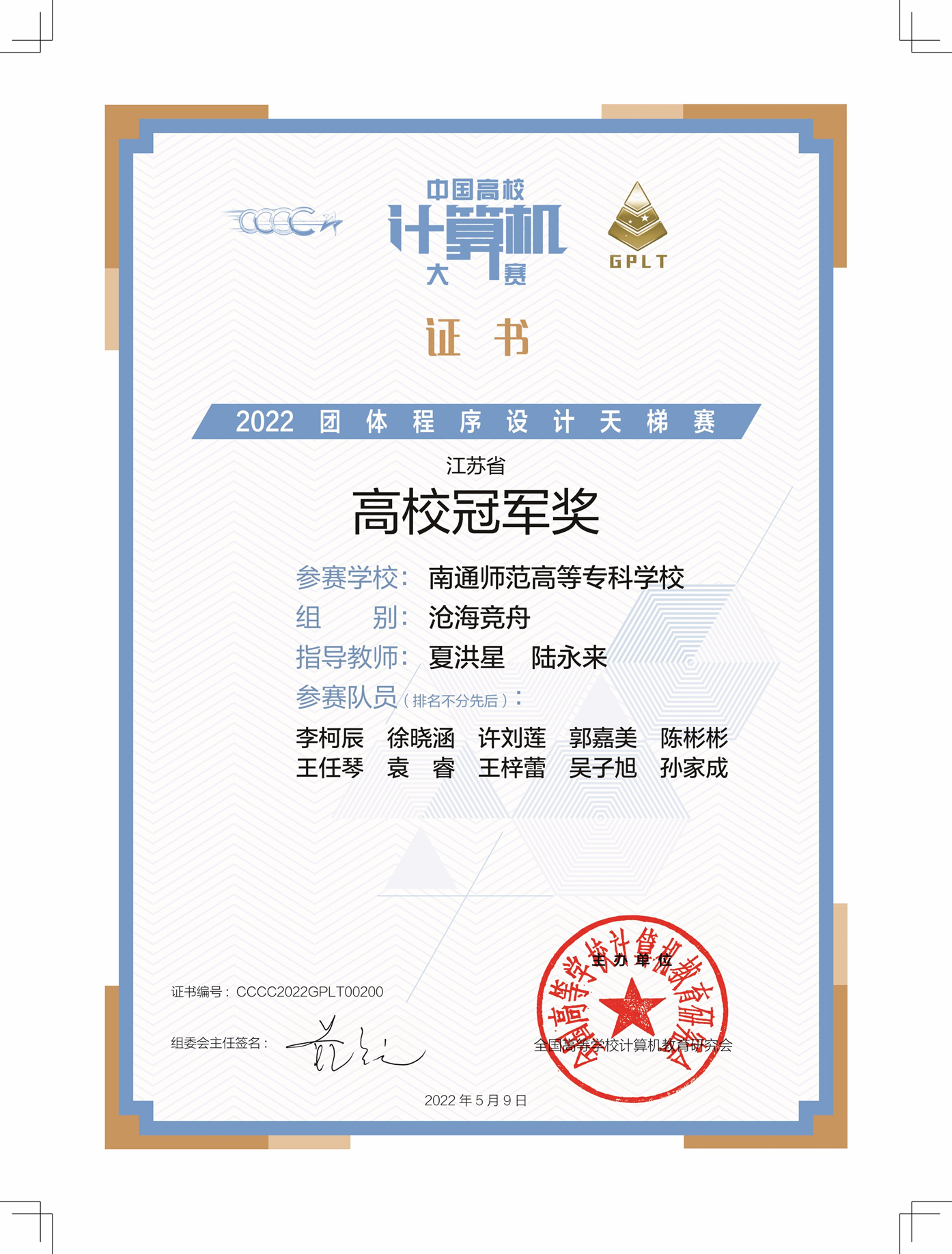 近日,由全国高等院校计算机基础教育研究会主办,全国各参赛高校在线承办的第七届中国高校计算机大赛-团体程序设计天梯赛获奖名单正式公布,我校代表队获得江苏省冠军奖。在本次比赛中我校信息技术学院共派出10名同学组成代表队参加了高职高专“沧海竞舟”组比赛。在比赛中同学们团结协作、奋勇拼搏,最终获得江苏省高校冠军奖的优异成绩。我校学子曾于2021年获得该赛项全省一等奖。