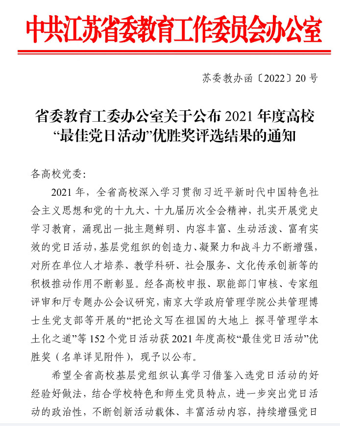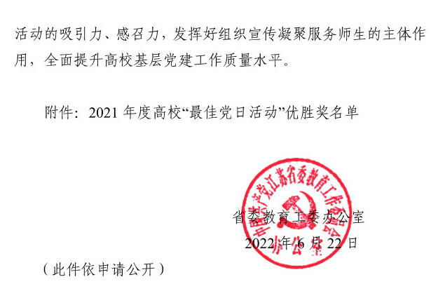 6月22日,江苏省委教育工委公布了2021年度高校“最佳党日活动”优胜奖评选结果,我校美术学院党支部“ 美师美生:传递美的力量”荣获2021年度江苏省高校“最佳党日活动”优胜奖。