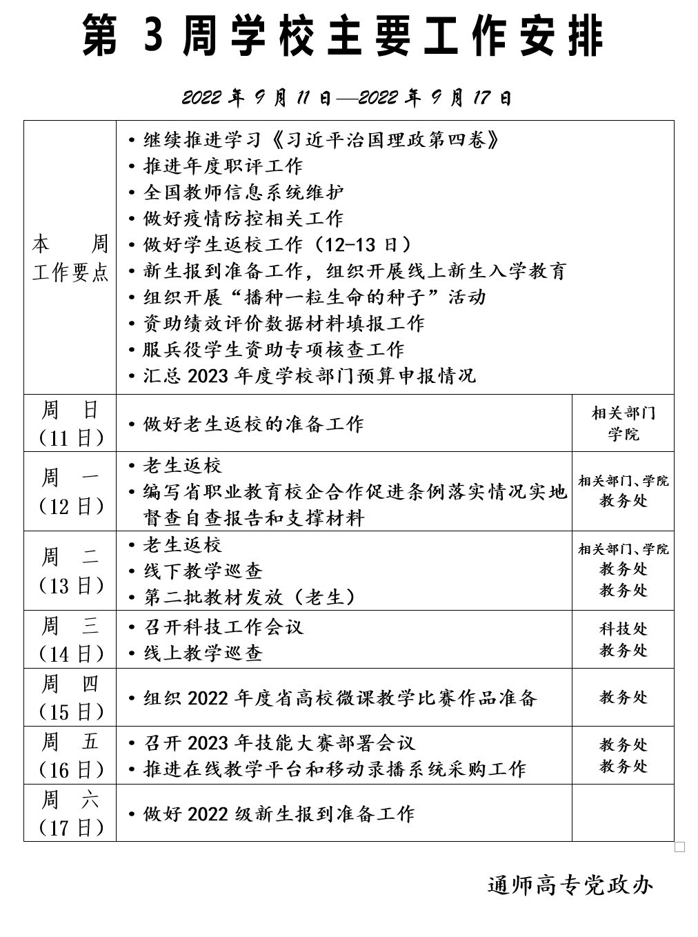 2022-2023学年第一学期第3周学校主要工作安排