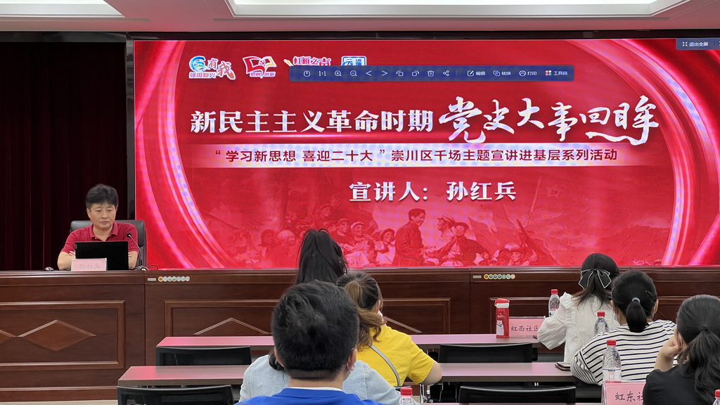 9月22日,由我校马克思主义学院(下称“马院”)与崇川区委宣传部联合举办的“‘学习新思想 喜迎二十大’初心讲堂进社区进企业进校园”系列宣讲活动在虹桥街道虹桥社区举行,马院院长孙红兵为社区党员群众作了《新民主主义革命时期党史大事回眸》的专题宣讲。学校党委书记刘锋,崇川区委副书记徐海燕,崇川区委常委、宣传部部长杨晶晶,学校党委委员、组织宣传部部长魏荣华等领导同志出席活动。