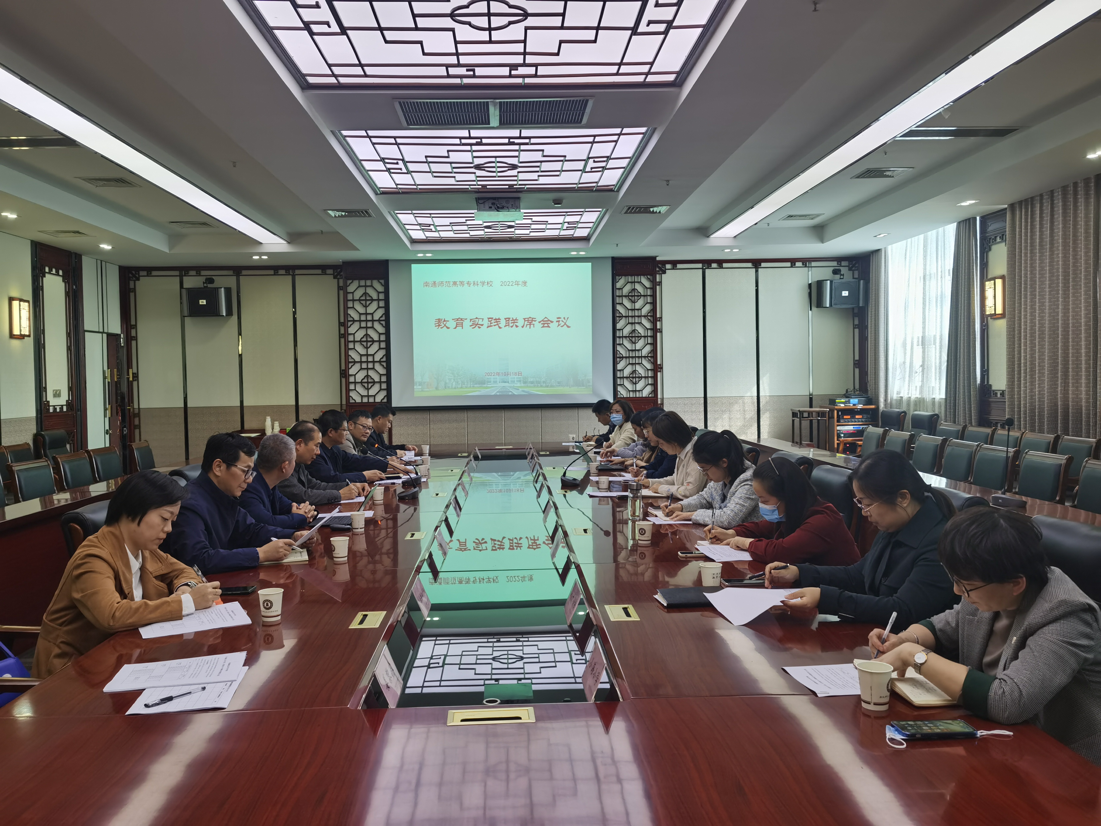 10月18日下午,教务处组织召开了2022年度教育实践联席会议,邀请崇川区、开发区和苏锡通园区教育主管部门和11家实践基地的代表共同研讨实习工作方案,部署本次教育实践工作。校内出席会议的有副校长孙国春、教务处处长张建平以及初等教育学院、音乐舞蹈学院、美术学院、体育学院的教学分管院长等。会议由张建平处长主持。