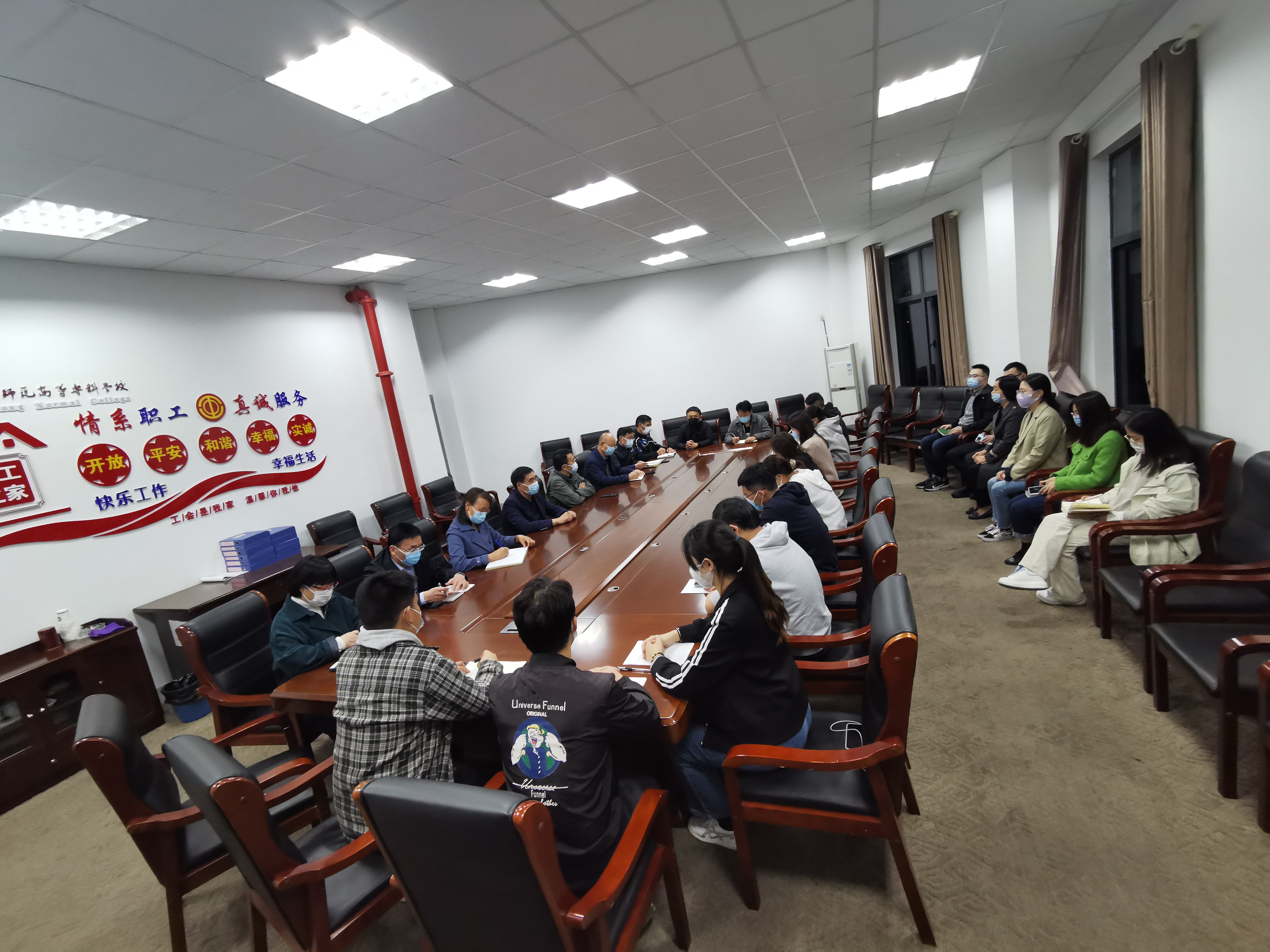 19点30分,刘锋书记主持召开辅导员座谈会。他通报了目前南通疫情防控的总体形势和学校疫情防控管理的总体要求。