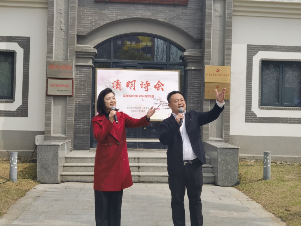此次诗会主题鲜明、内容丰富,形式新颖,是一场“红色”的视听盛宴。每个节目都凝聚着同志们的满腔热忱和崇敬之情。其中,许迅老师与特邀嘉宾南通艺术剧院褚筱玲老师共同朗诵《永生的和平鸽》,沉稳洪亮的嗓音传递着和平的呼唤,让我们感受到和平的力量,以及对美好生活的愿景!张珏老师的一首《感悟清明》,带我们领略了“清明节,雨晴天;花色融,人竟赏”的意境,为诗会增添了一抹“一朝春雨过,万物皆清明”的氛围。“英雄是浑身弹孔仍用双臂紧抱红旗的人,是心灵满身伤疤仍眷恋家国的人……”,由组宣部魏荣华、汪薛松、许迅、陈琳四位老师共同朗诵的诗篇《英雄》激情昂扬,振奋人心,传递着一代代革命者生生不息的呐喊,英雄不朽丰碑永远矗立在我们心中,伟大复兴的旗帜永远引领我们向前。由无产阶级革命家刘瑞龙作词、音乐舞蹈学院黄忠老师谱曲,师生同台演绎的《狼山抒怀》,以歌与诗完美结合的方式,展现了新型艺术表现形式的魅力,抒发了豪迈的胸怀和对家乡的热爱之情,表达了不忘初心、缅怀革命前辈的情思。