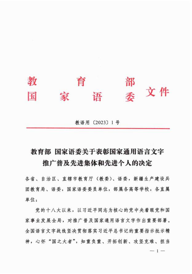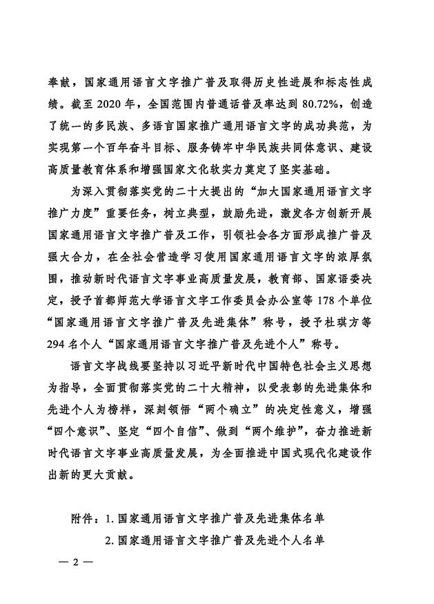 会上宣读了《教育部国家语委关于表彰国家通用语言文字推广普及先进集体和先进个人的决定》,授予178个单位“国家通用语言文字推广普及先进集体”称号,294名个人“国家通用语言文字推广普及先进个人”称号。这是《国家通用语言文字法》施行22年来的首次表彰活动,是贯彻落实党的二十大“加大国家通用语言文字推广力度”战略部署的重要举措。