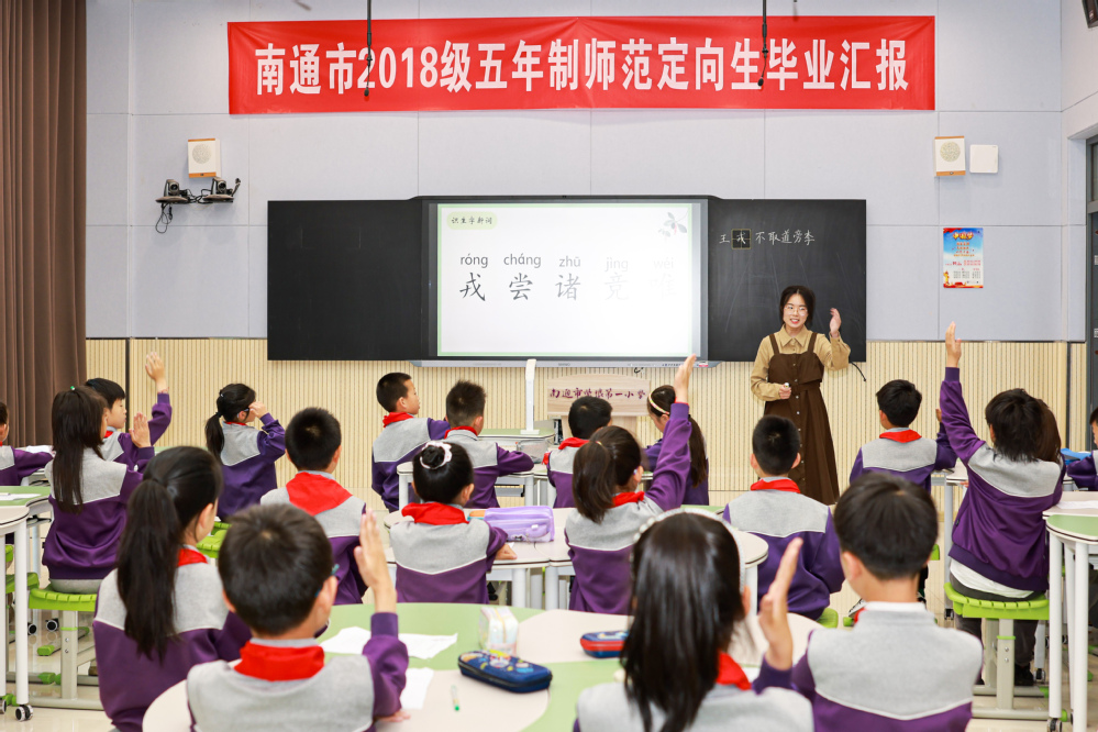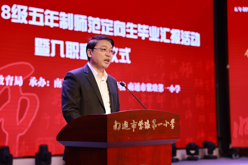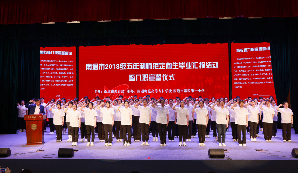 5月17日,2018级五年制师范定向生毕业汇报活动暨入职宣誓仪式在我市紫琅第一小学举行。市委教育工委书记、市教育局党组书记、局长成宾,市教育局四级调研员余宙,南通师范高等专科学校校长朱月萍、副校长孙国春,南通市教师发展学院院长孙亚丽,紫琅第一小学校长姜树华,以及来自我市各区、县、市的182名定向生参加活动。仪式由市教育局人事处处长陈新荣主持。