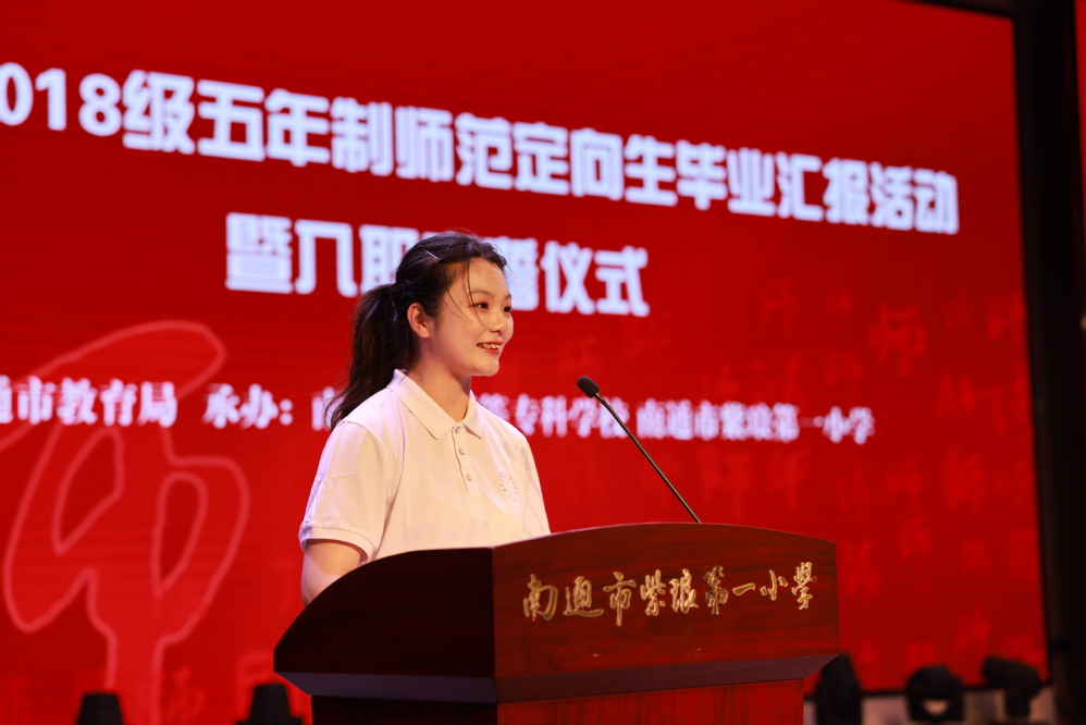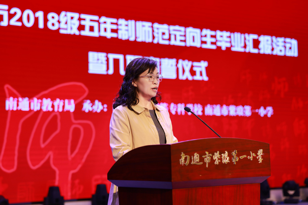 她殷殷嘱托在场的2018级定向生:要传承师道,做扎根基层、献身教育的模范。希望大家坚持终身学习,永葆创新热情,用“扎实学识”努力向下扎根、向上发展,成为中国乡村教育的脊梁,撑起乡村教育的美好明天;要传承师德,做立德树人、言传身教的模范。希望大家践行立德树人使命,正己修身,守住心中净土,远离功利之风,去除浮躁之气,执着于为人师表、教书育人;要传承师爱,做敬业爱生、立己达人的模范。希望大家不负韶华、不负时代、不负人民,在青春的赛道上奋力奔跑,做新时代“四有”好教师。与通师高专一大批出类拔萃、德才兼备的校友一道,大笔书写南通基础教育新的辉煌。