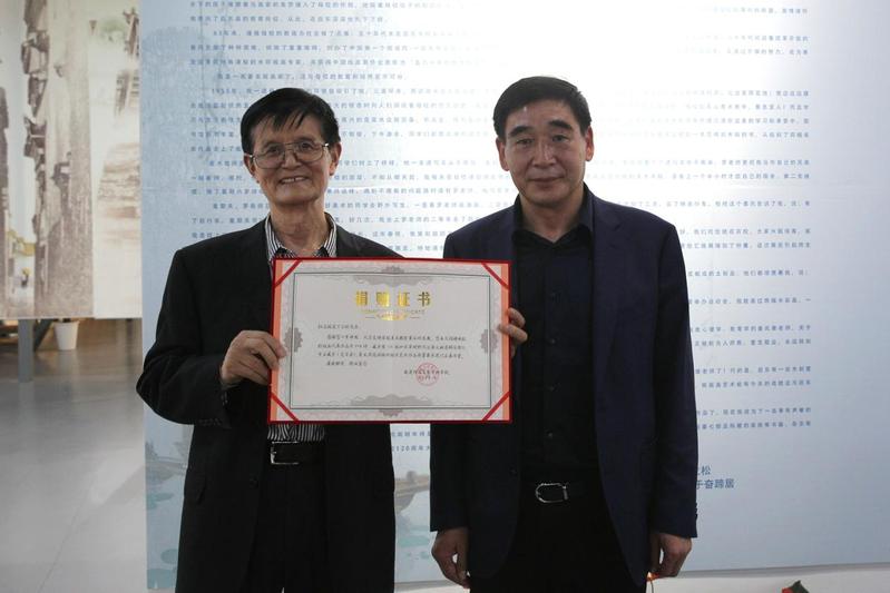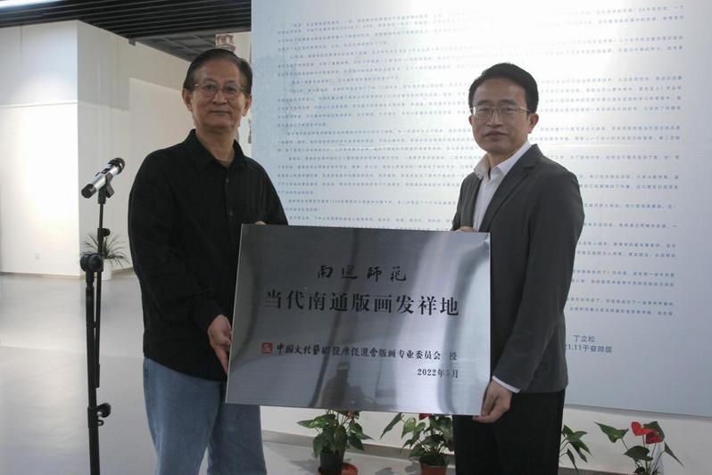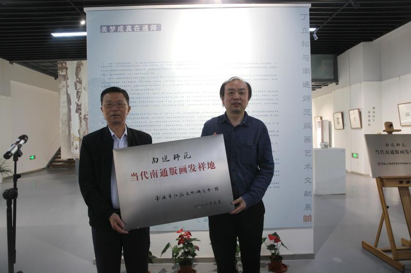 最后的授牌和颁发捐赠证书仪式,陈超代表中国文化艺术发展促进会版画院、周剑浩代表南通市江海文化研究会分别向学校授“南通当代版画发祥地”牌匾。刘锋代表南通师范高等专科学校为丁立松先生颁发了捐赠证书和纪念品。