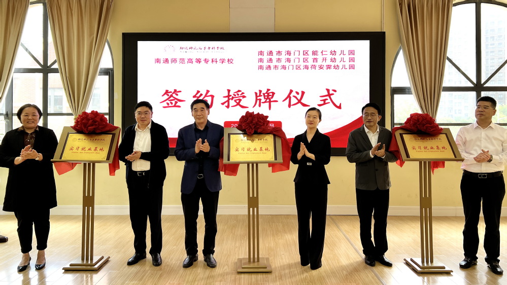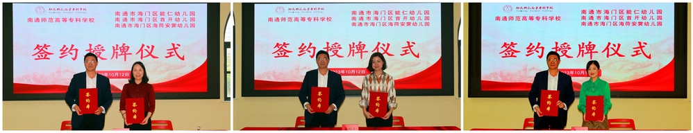 学校与海门区首开幼儿园、能仁幼儿园和海荷安霁幼儿园分别签订《实习就业基地协议书》并授牌,共建学前教育专业海门区实习就业基地。双方将在师资队伍建设、教育教学研究和师范生实习就业等各方面加强合作交流。