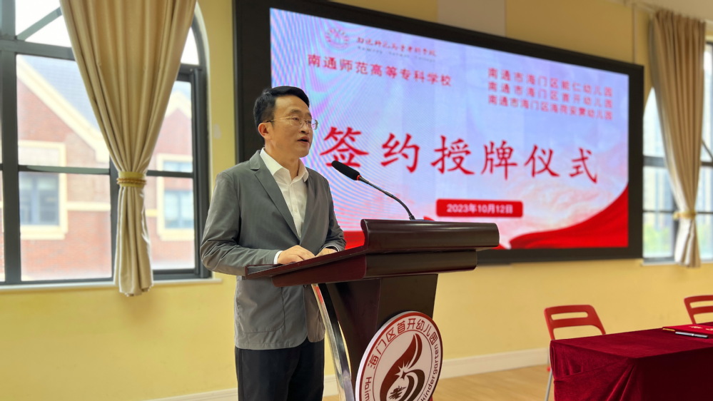 10月12日,南通师范高等专科学校学前教育专业海门区实习就业基地授牌仪式在海门区首开幼儿园举行。学校党委书记刘锋,海门区人民政府副区长王瑊,学校党委委员、副校长都樾,党委委员、宣传部部长马文娟,海门经济技术开发区党工委委员、管委会副主任、海门街道党工委书记陈忠,海门区委教育工委书记、教体局党组书记、局长朱建军出席活动并为实习就业基地揭牌。活动由海门区教体局副局长施健斌主持。