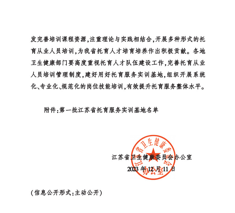 近日,收到江苏省卫生健康委办公室文件通知(苏卫办人口〔2023〕4号),我校获评第一批江苏省托育服务实训基地之一。