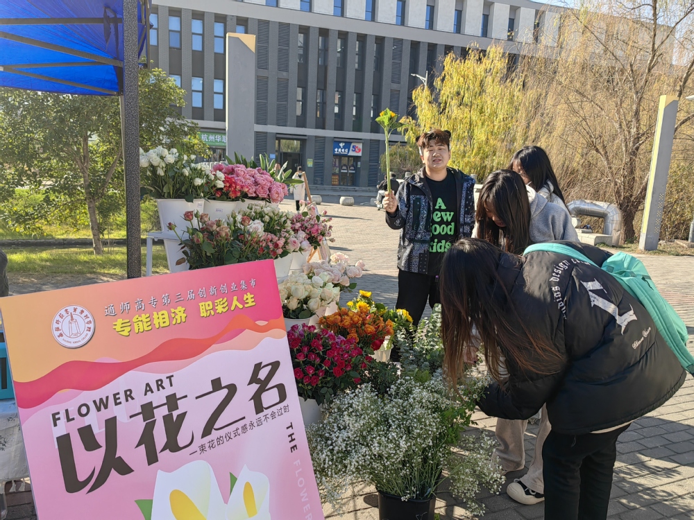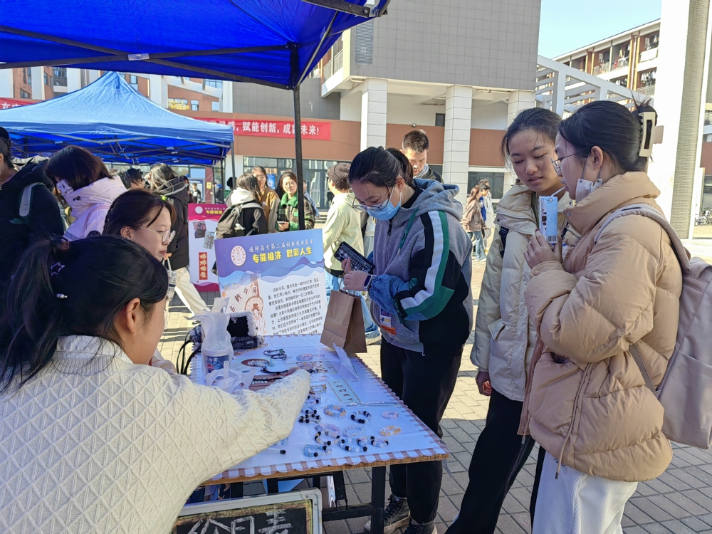 本次创新创业集市的主题为“专能相济,职彩人生”,由教务处和大学生就业创业指导中心联合承办,旨在让学生专业学习的同时,注重知识的迁移,用创新的思维激发灵感,在真实场景中提升就业竞争能力。本次活动除了传统的剪纸书画、珠串编织、手工泥塑,以及职业技能大赛的艺术插花、声乐器乐表演外,还特别邀请了合作单位的街道社区进行非遗文化展示、国际贸易业务合作单位的外贸商品展售等环节,让学生在玩乐中感受技能的变现,在交流中提升能力,在活动中拓展视野。
