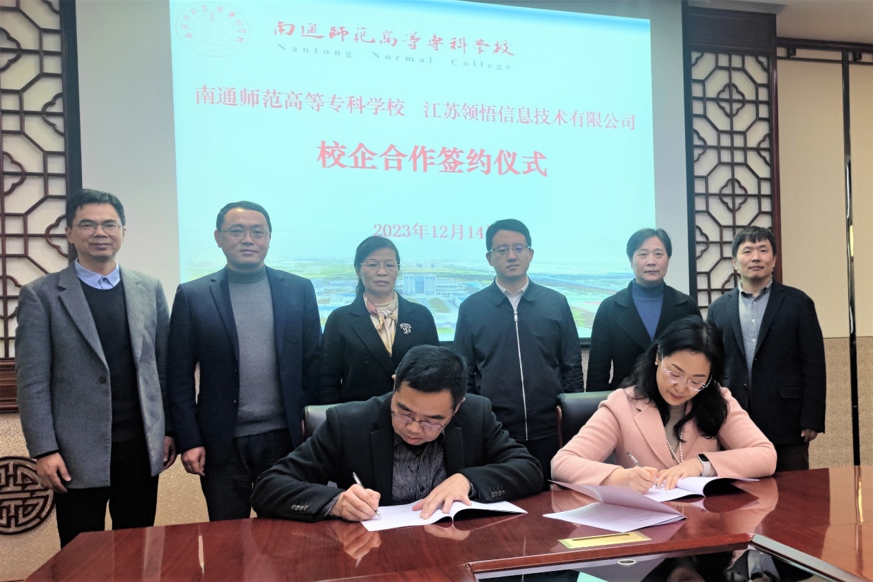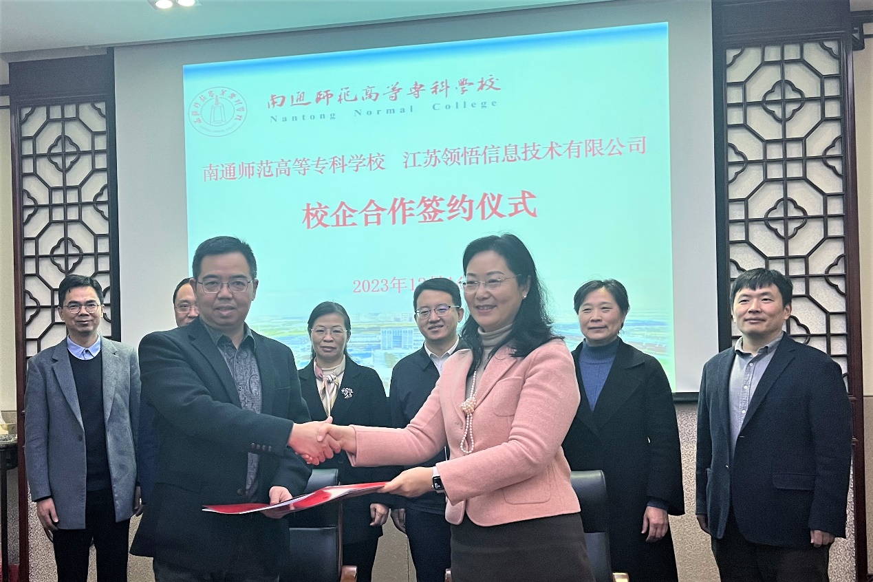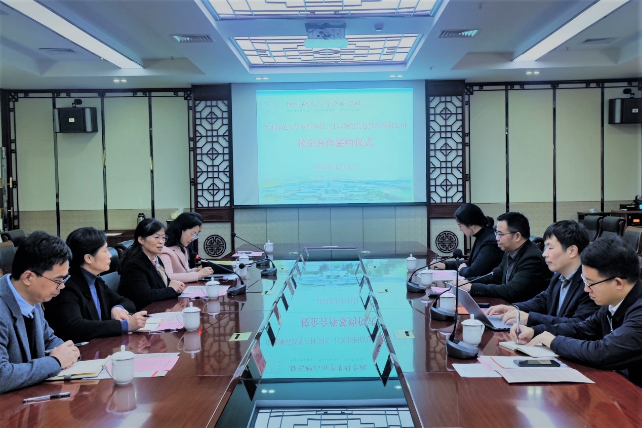 12月14日,江苏领悟信息技术有限公司总经理严洪涛、副总经理张军、总经办主任王林熙,以及南通经济开发区管委会上海招商局杨光明局长一行,来到我校进行政校企合作洽谈并签署了合作协议。我校党委副书记、校长朱月萍,党委副书记陈玉君,科技产业处处长赵晓梅,信息技术学院陆永来院长、夏洪星副院长等参加了此次活动。