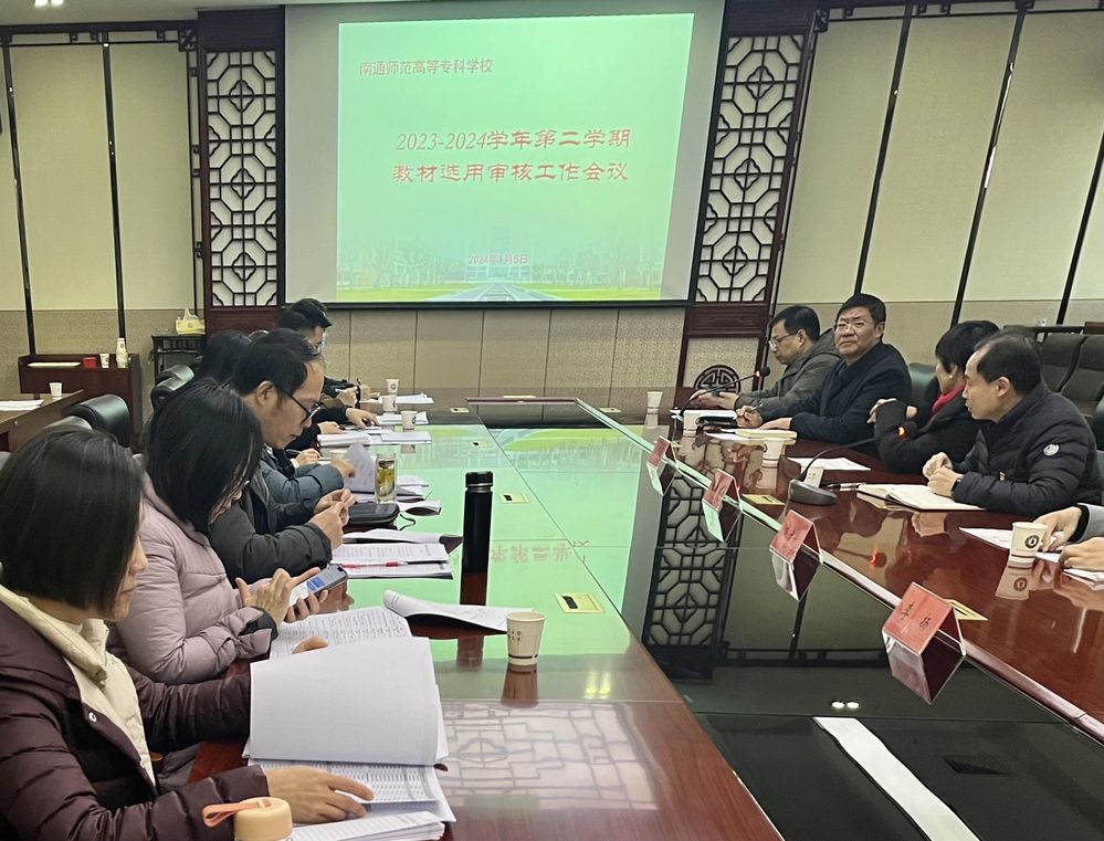 曹军副处长宣读了《关于成立南通师范高等专科学校教材选用委员会的通知》(通师高专教〔2023〕17号),汇报了教务处对各学院选用教材的初审情况,指出了教材选用征订过程中存在的问题,强调要进一步加强国、省规划教材选用比例,提升教材选用质量。