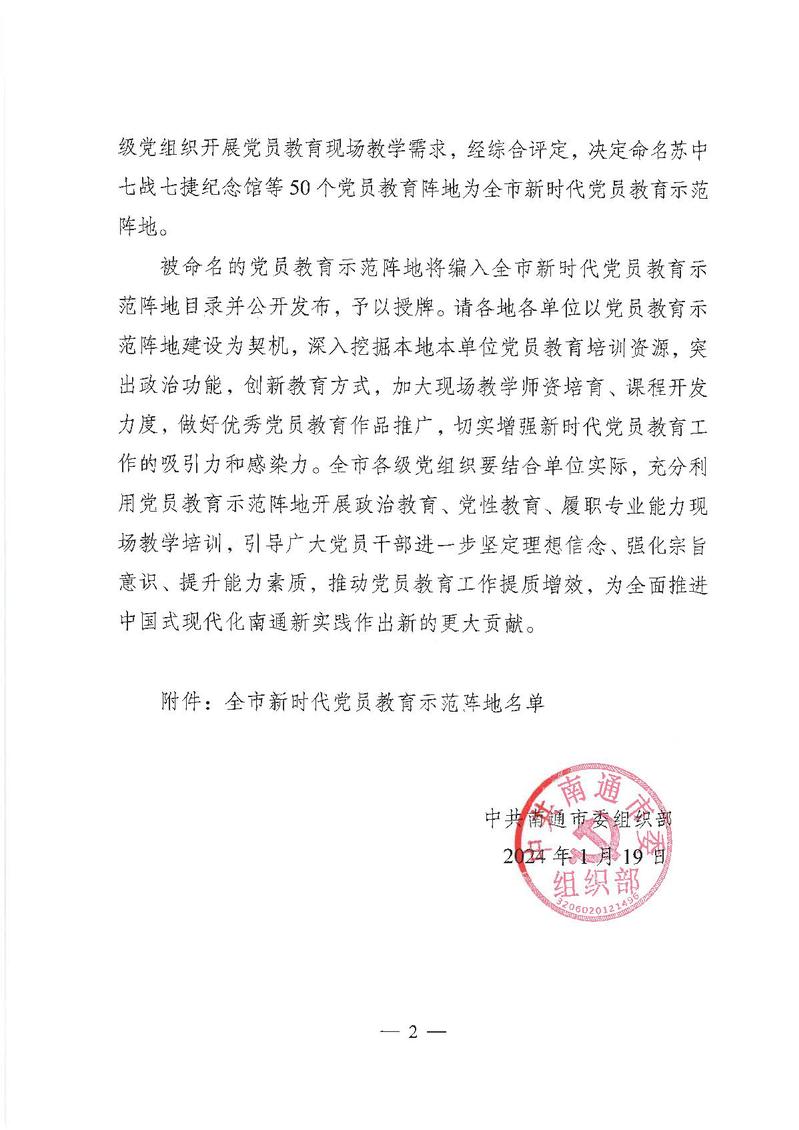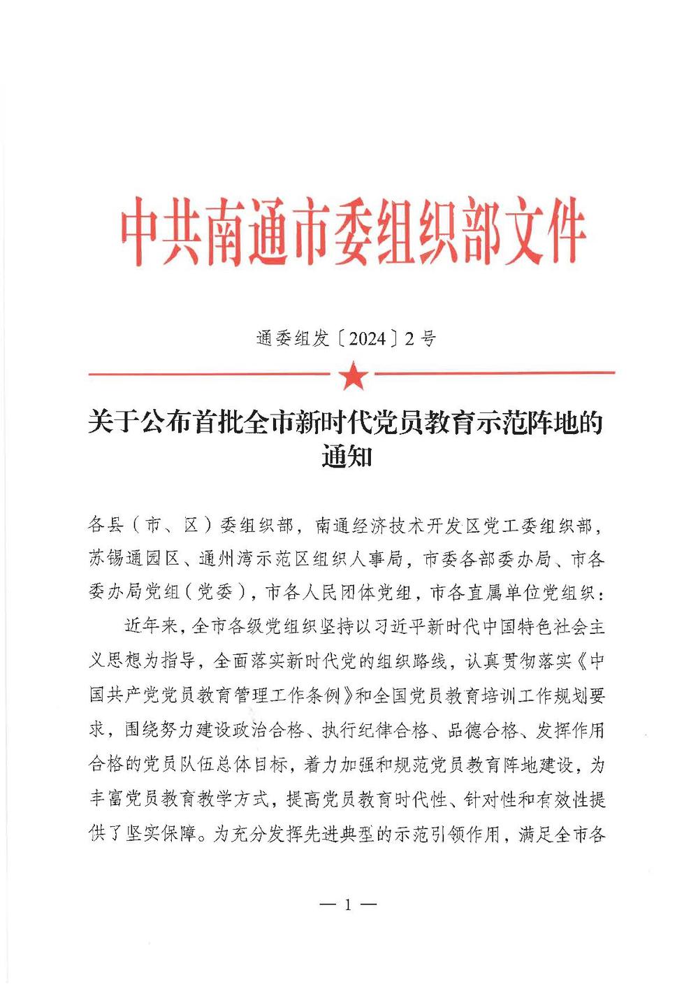 近日,南通市委组织部公布首批全市新时代党员教育示范阵地,我校红色师范纪念馆获评“红色资源及爱国主义教育类”示范阵地。这是我校红色师范纪念馆继获得“江苏省党员教育实境课堂示范点”、“南通市‘初心使命’党性教育基地”、“南通市干部教育培训‘五星’现场教学点”、“离退休干部党员教育实境课堂”、“南通市青少年德育基地”等荣誉称号后获得的又一荣誉。