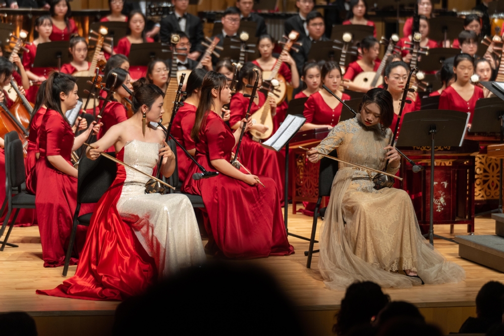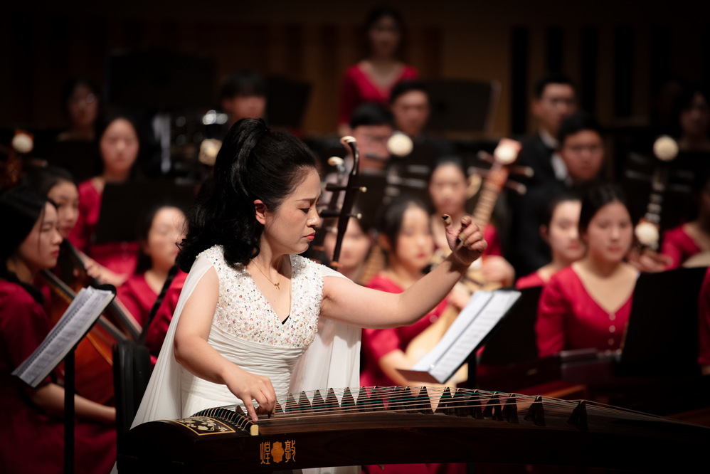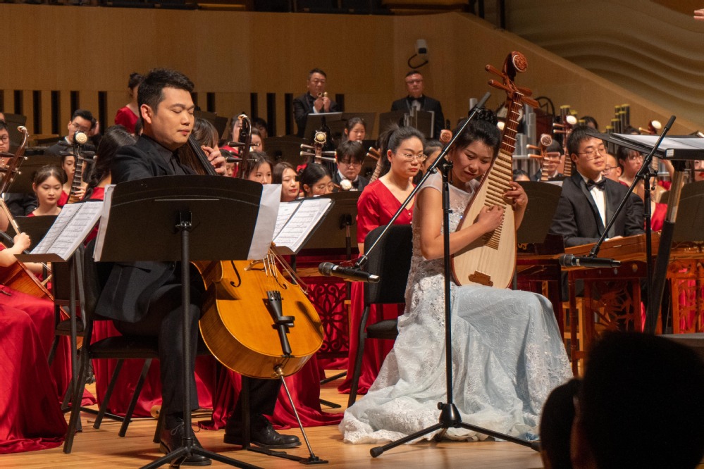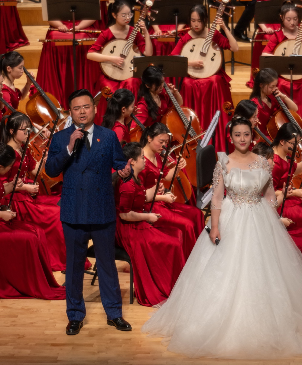 音乐会由音乐舞蹈学院院长黄忠和特邀指挥张伟执棒。演出在热烈欢腾的《庆典序曲》中拉开帷幕,观众的热情被迅速点燃;由施娓和南京民族乐团大提琴演奏家田琦老师共同演绎的琵琶、大提琴和乐队《彝族舞曲》,旋律优美,节奏粗犷,把观众带到了彝家山寨迷人的夜色和欢乐的舞蹈场景中;《腊梅》以中华传统文化形象为题材,咏物言志,尽显文人风骨;古筝与乐队《兰亭》所体现的书法与音乐艺术之间相得益彰的情韵,被张露老师高超的古筝技术演绎得淋漓尽致;江苏省民族乐团青年竹笛演奏家孟诗文老师演奏的竹笛协奏曲《雪意断桥》,唯美缠绵,深情舒展;潘罗慧子和刘贤凤老师的双二胡与乐队《乔家大院--情爱》更是荡气回肠,欲说还休,让观众沉醉不已;曾获第七届大学生艺术展演一等奖的《抒情变奏曲》充分展示了作品的艺术内涵;由南通市委宣传部、南通市音乐家学会等联合创作的《誓言》把音乐会推上了高潮,蓝天翔和司云辰子老师以及校学生合唱团饱含深情的演唱,体现着对党的忠诚。最后全场在庄严的宣誓“为共产主义奋斗终身!”中落下帷幕。