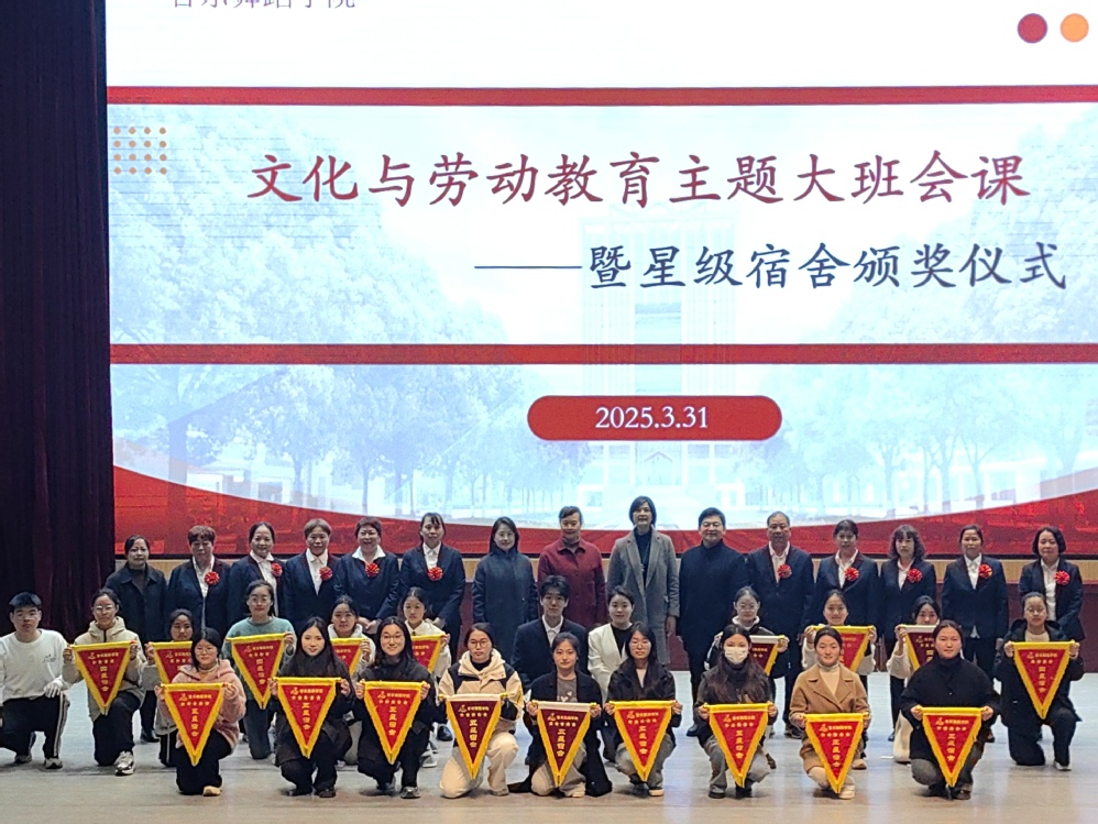 3月31日下午3:30,我院在图文楼大报告厅隆重举行了“文化与劳动教育”主题大班会课暨星级宿舍颁奖仪式。学工处处长缪兴秀、宿管老师代表、学院德育管理团队及全院学生参加了此次活动。