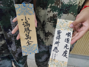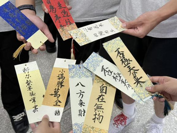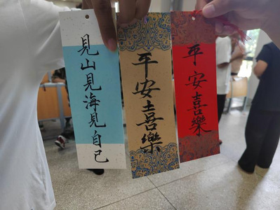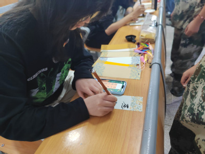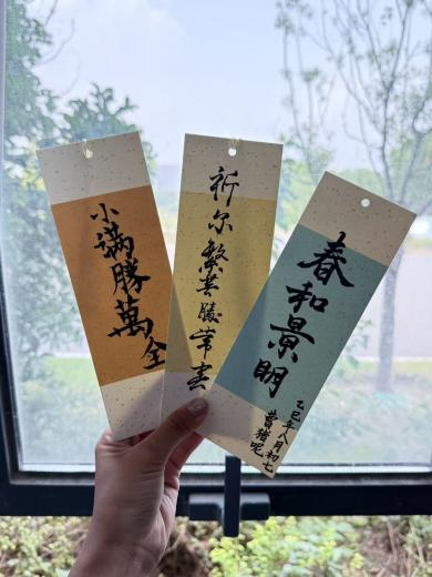 本次活动特别邀请了美术学院的同学们现场助阵。他们凭借专业的书法技艺,化身温暖的“能量使者”,耐心倾听每位同学的个性化需求,随后挥毫泼墨,在方寸书签之上题写下一句句真诚的激励话语。“前程似锦”“保持热爱”“宁静致远”“平安喜乐”……这些寄托着美好祝愿的词语,或苍劲有力,或娟秀雅致,在笔尖流淌,跃然笺上。每一笔描绘,每一句书写,都凝聚着对同学们深深的祝福与鼓励。