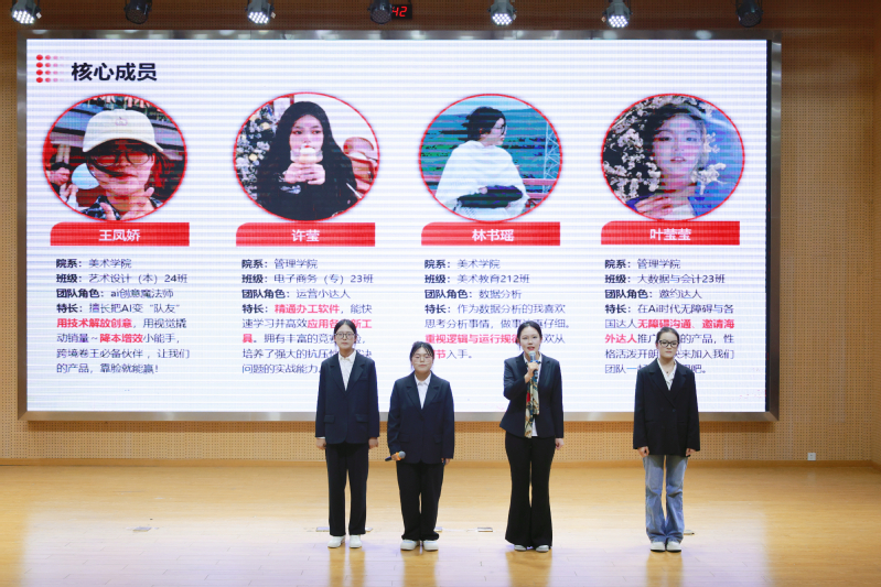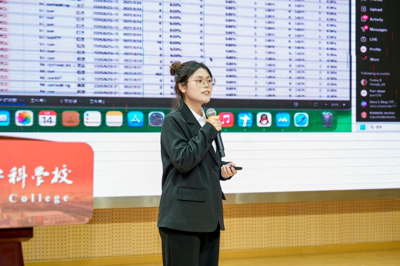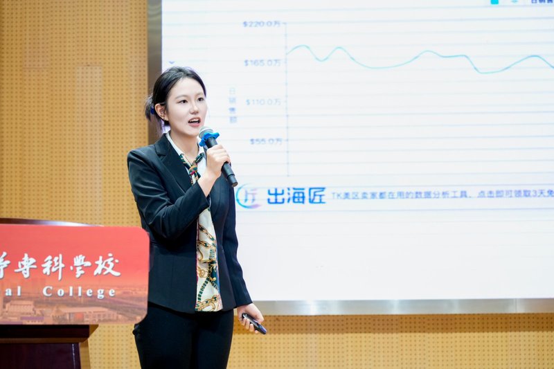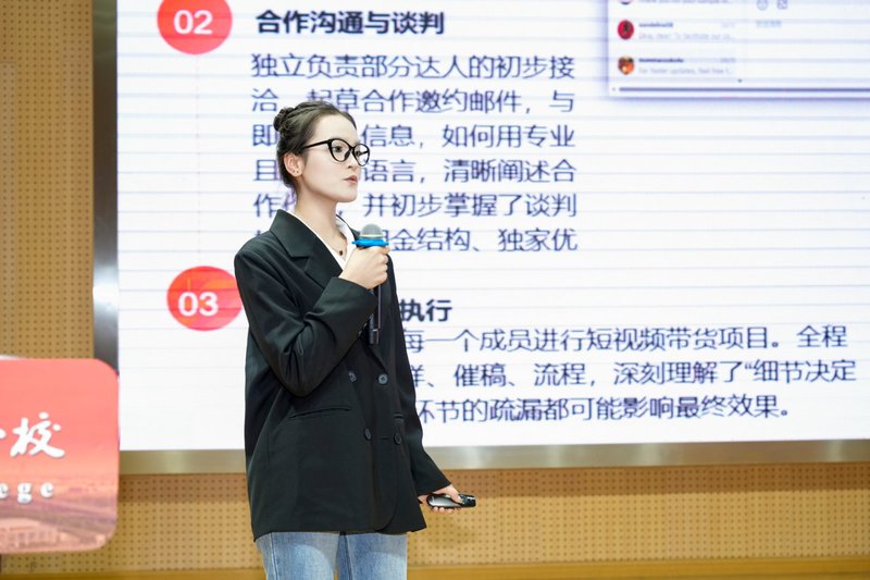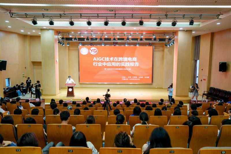 随后,来自美术学院与管理学院的四名学生代表依次登台,分享了AIGC技术在跨境电商中的实际应用,涵盖创意设计、AI数字化运营、达人建联以及智能ERP系统在订单、售后与客服环节的运用。公司依托丰富的行业资源与实战经验,为学生搭建了体系完善、高起点高标准的学习实践平台。