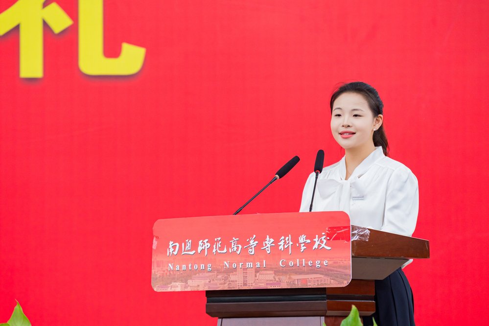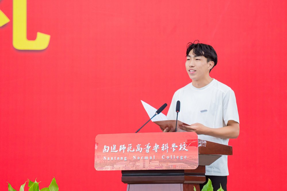 学长代表、音乐舞蹈学院宗佩雯同学以“拥抱新篇章,共绘未来蓝图”为主题,结合自身经历,鼓励学弟学妹学会“归零”以拥抱新可能、学会“平衡”以管理时间、学会“感恩”以珍惜情谊,尽快融入通师高专这个充满活力与梦想的大家庭。新生代表、初等教育学院梁宇浩同学表达了成为一名通师高专学子的激动与荣幸。他围绕“逐梦播音路,笃行师范心”,阐述了对于校训“坚苦自立 忠实不欺”的初步理解,并立志在未来学习中夯实专业基础,涵养教育情怀,努力成为“传播中国声音 讲好中国故事”的时代新人。