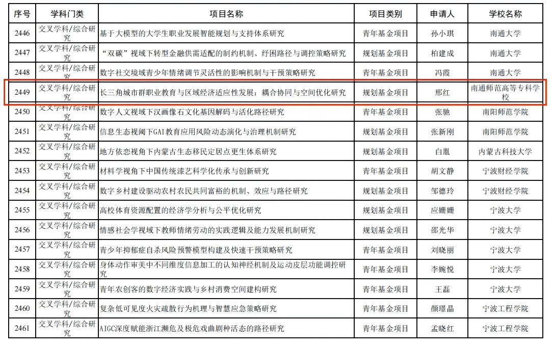 近日,教育部社会科学司公示了2025年度教育部人文社会科学研究项目评审结果,我院邢红博士主持申报的《长三角城市群职业教育与区域经济适应性发展:耦合协同与空间优化研究》项目获批立项。