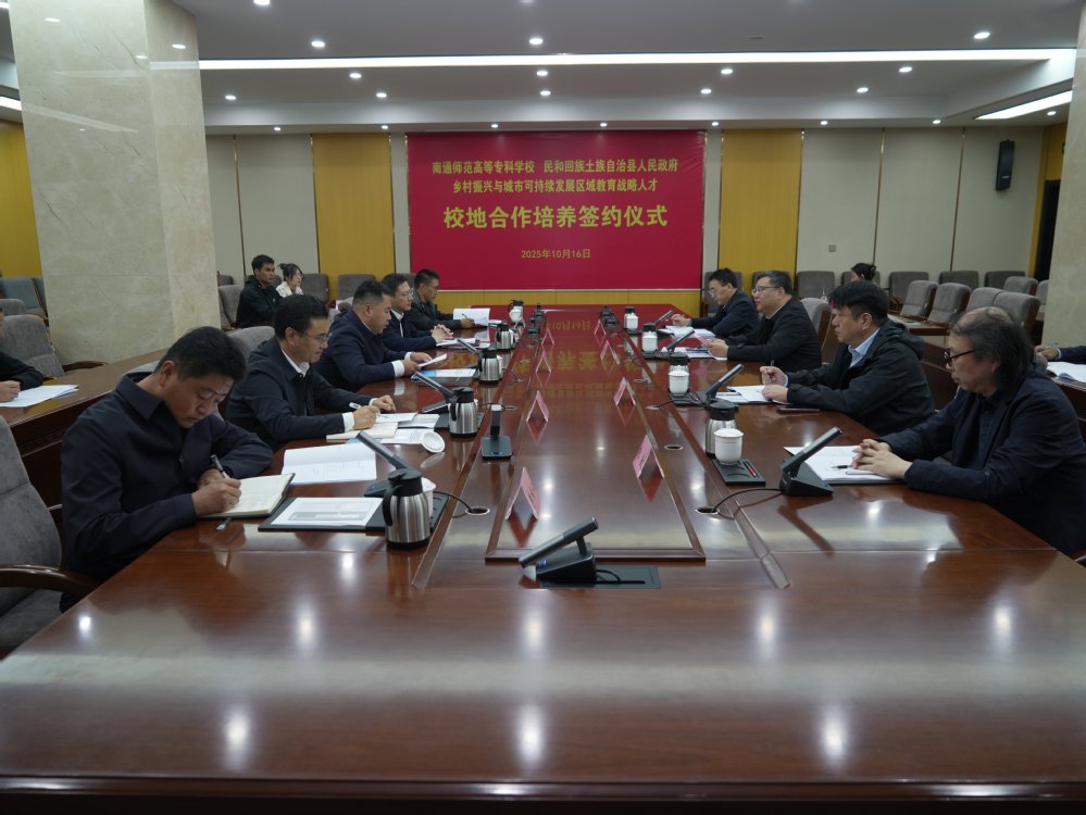 仪式上,马忠录回顾了自2023年以来双方合作取得的积极成效:累计向通师高专输送16名幼儿保育专业学生,组织13人次校领导及教师赴南通交流学习,有效缓解了民和县学前教育人才供给不足的问题。岳峰校长表示,过去三年,双方以真诚与务实行动,使“苏青”教育协作之花生根发芽、绽放芬芳;未来三年,学校将以此次续签为契机,聚焦“提质增效、深化拓展”,在人才培养模式上寻求突破,在资源共享维度上扩大范围,在协作领域拓展上谋划新篇,推动合作从“良好开局”迈向“高质量发展”。随后,盛斌与朱岩分别代表双方续签合作协议,标志着校地合作从“基础共建”迈入“深度共赢”的新阶段。
