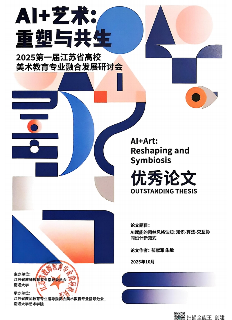 金秋送爽,硕果盈枝。在近日成功举办的“AI+艺术:重塑与共生——2025第一届江苏省高校美术教育专业融合发展研讨会” 中,我校美术学院教师郁献军、朱敏合作撰写的论文 《AI赋能的园林风格认知:知识-算法-交互协同设计新范式》 ,荣获优秀论文奖!